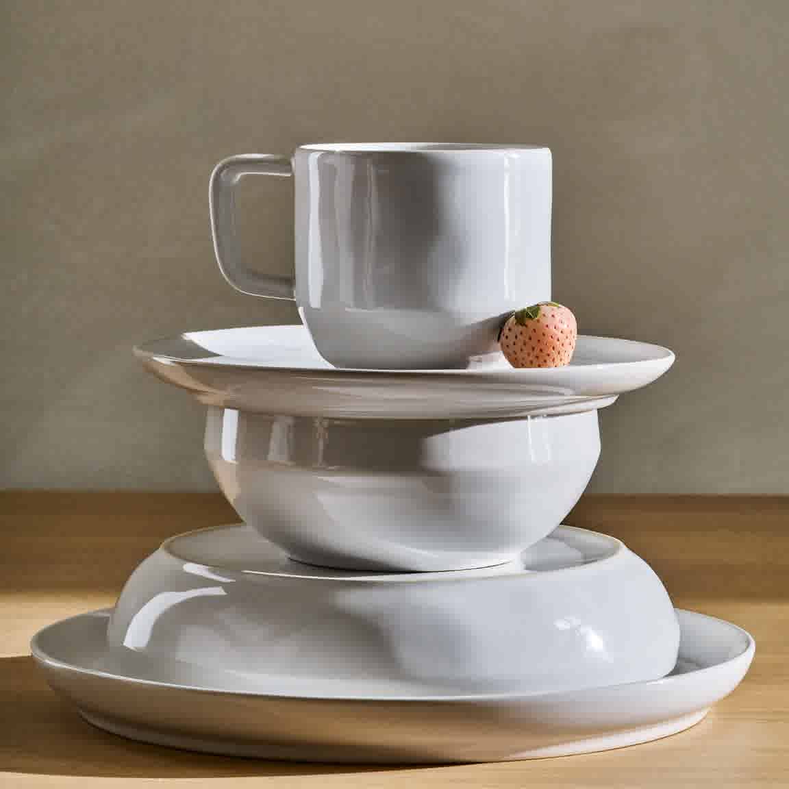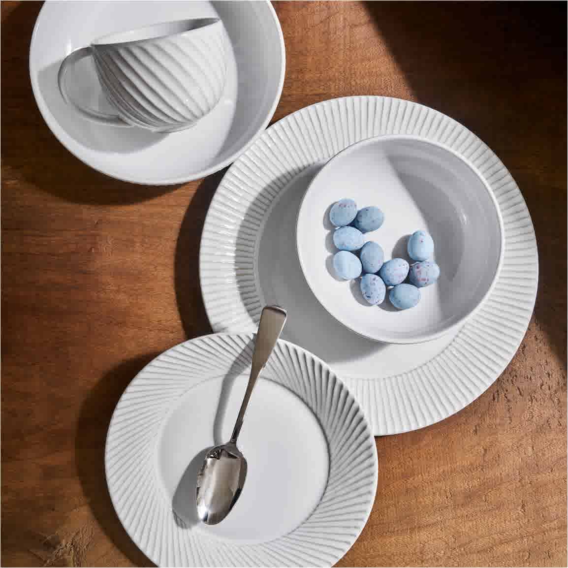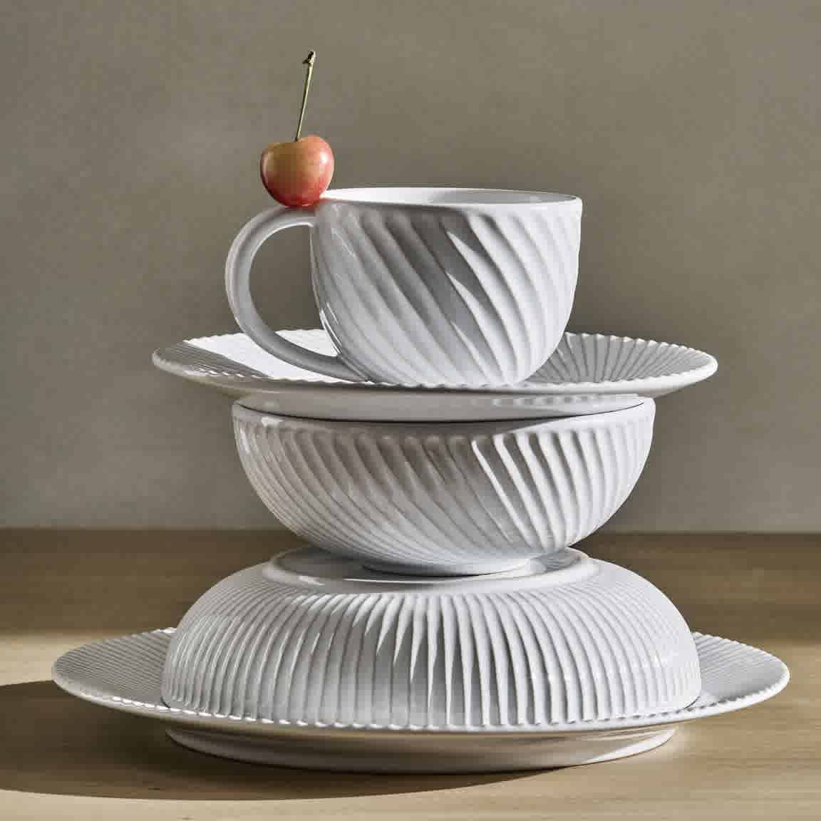 Made by artisans from locally sourced clay, this timeless dinnerware features elegant, fluted details and a warm, white glaze.