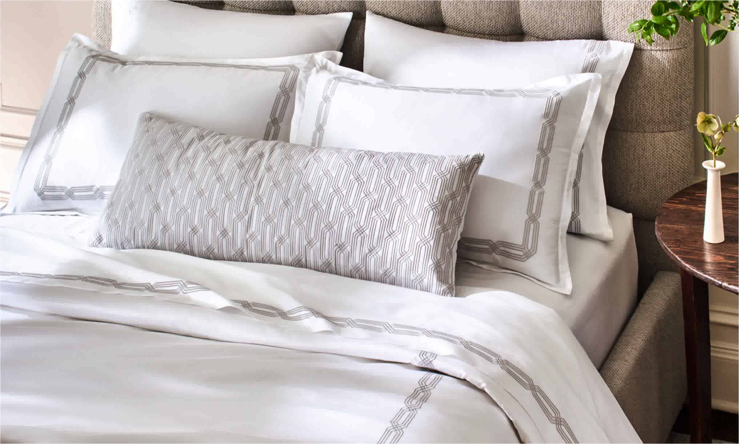 Beautifully crafted luxury bedding featuring neutral shades and abstract motifs in soft long-staple cotton.