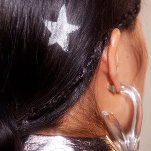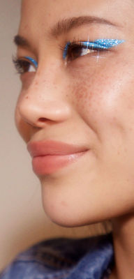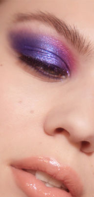 Multidimensional silver glitter tinted with pastels creates a holographic sparkle effect on lips and eyes.
