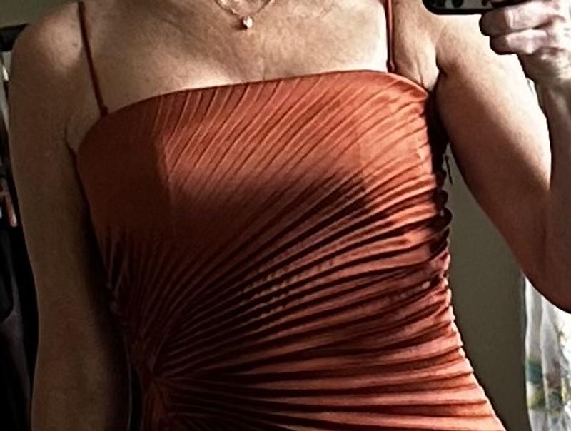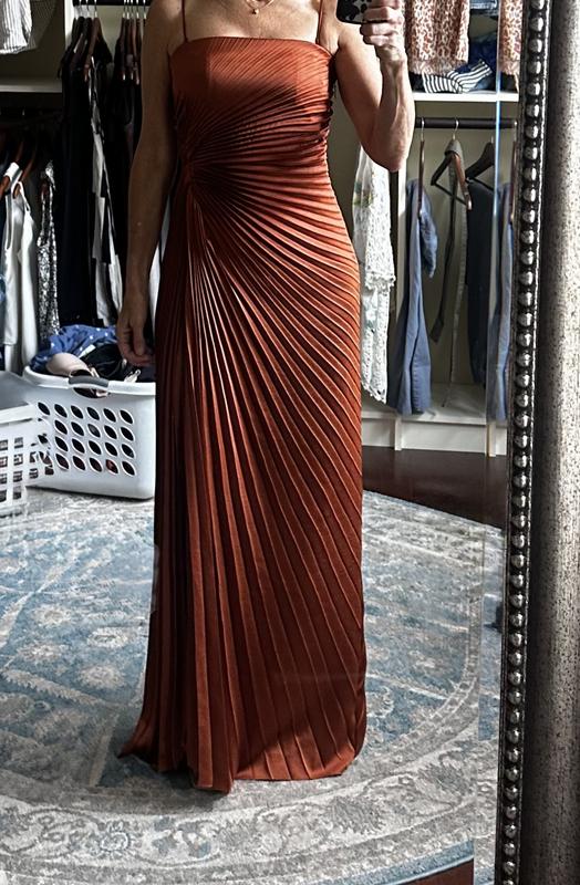 Purchased to wear as a wedding guest, perfect for an end of summer wedding it gave off sunset vibes but I could see this also working in the autumn as well. For reference I’m 5’5 130lbs and a 32c, would have purchased a size 6 except it was sold out so went with the 4 and so happy it worked out that way because it fit like a glove. The dress isn’t lined so I wore short spanx underneath and a strapless bra with barely any lining just to be comfortable but even without that the dress wouldn’t have moved because there’s a corset at the top that reallyyy secures you. 10/10 dress received compliments all night and definitely see myself wearing it again!!