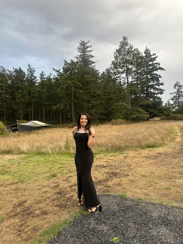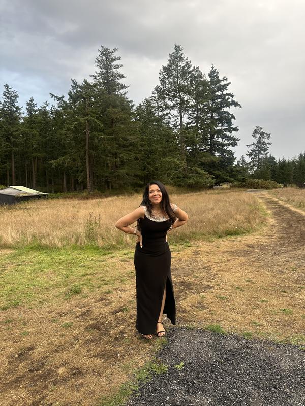 I wore this Adrianna Papell gown to a black-tie wedding, and it was absolutely perfect. The black color is timeless and elegant, and the slightly stretchy material made it super comfortable to wear all night. I could sit, move, and dance easily without feeling restricted. The beaded illusion mesh yoke is beautiful in person—adds just the right touch of sparkle without being over the top. I received so many compliments and felt so confident wearing it! For reference, I’m 5'0" and 120 lbs and ordered a size 4. The fit was great—flattering and true to size—but I did have to hem it a little since it ran long on me. Overall, this dress is classy, comfortable, and perfect for any formal event. I’d 100% recommend it!