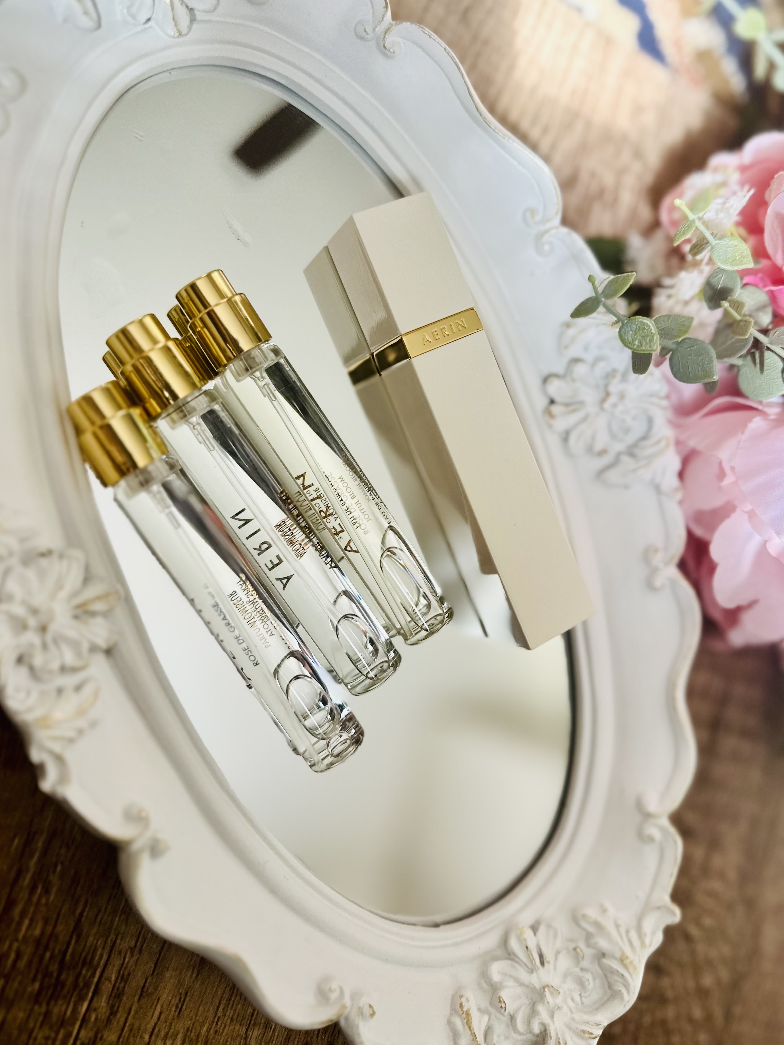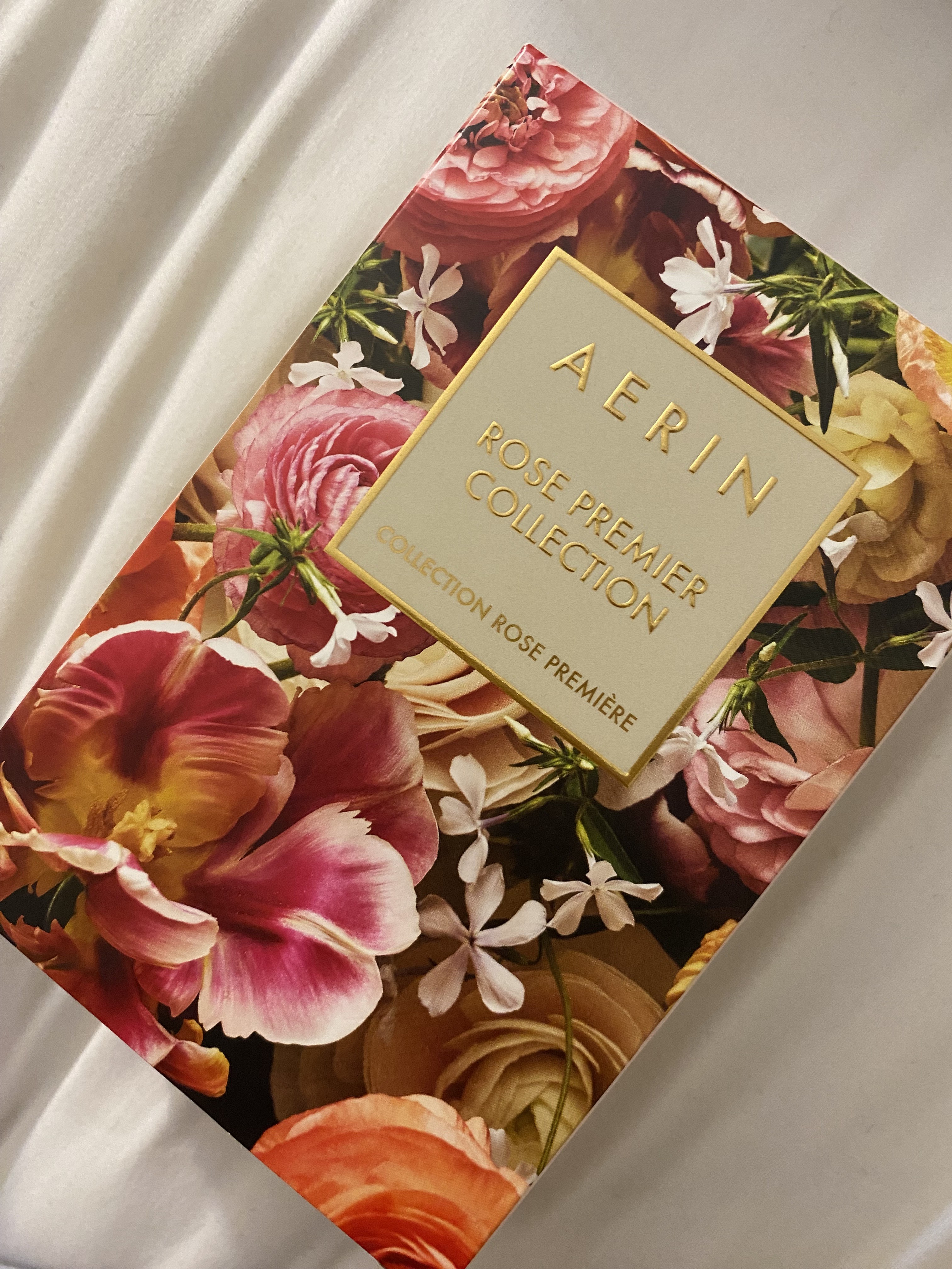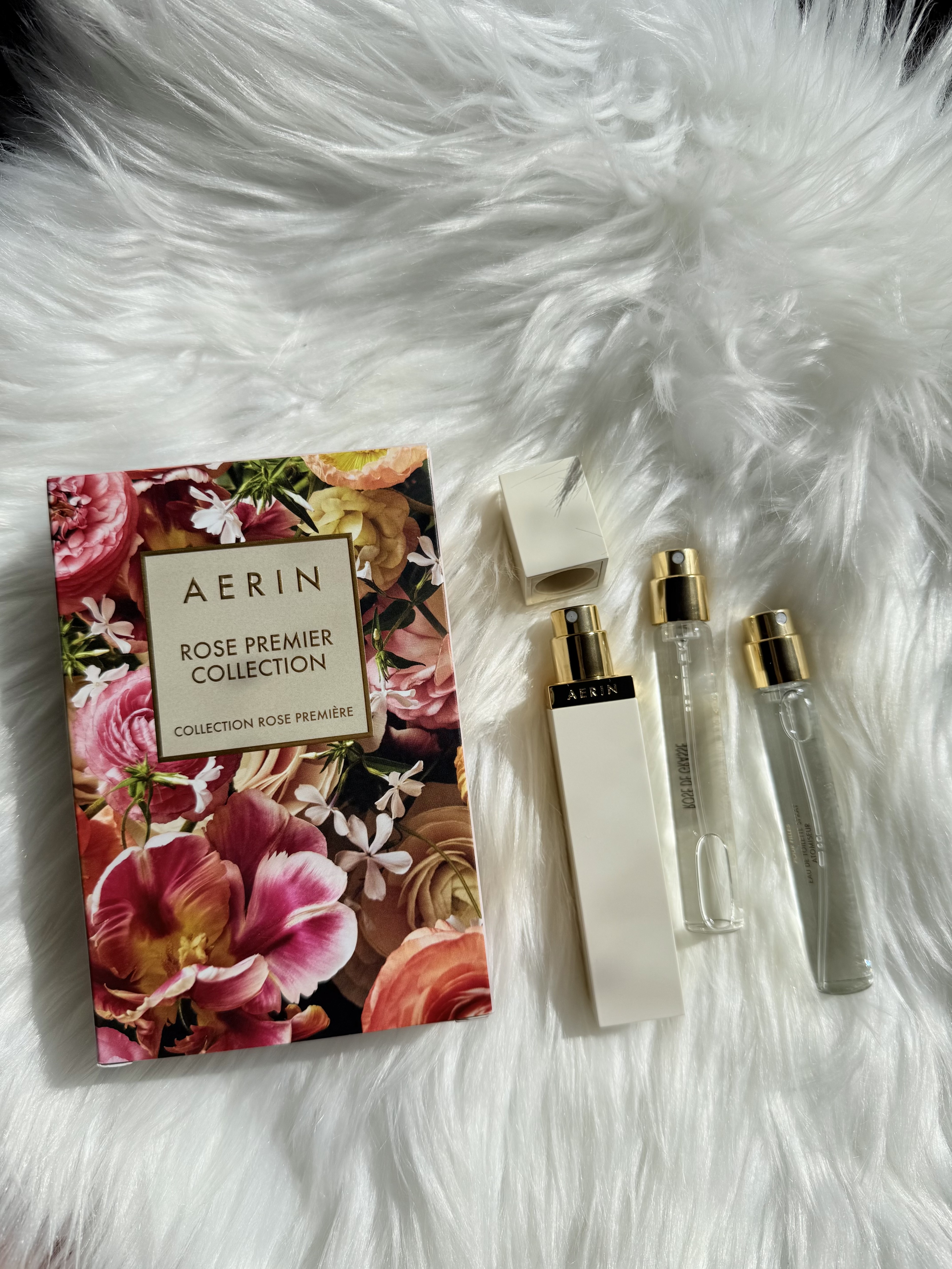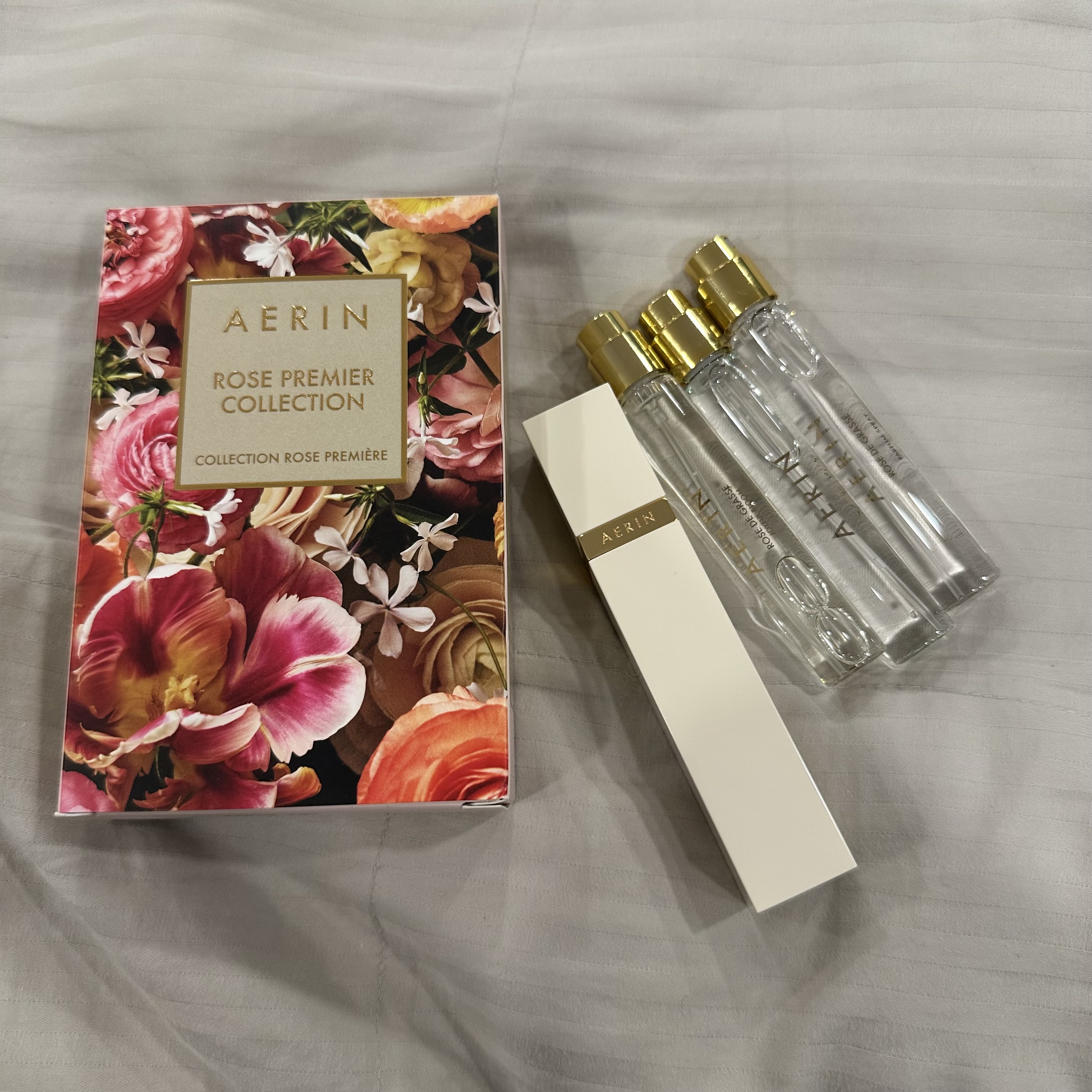 This set would be an excellent gift for Mother's Day! The perfume case—something I never realized I needed—has been incredibly useful. It transforms a basic glass vial into something that looks upscale and is perfect for travel. If you're a fan of rose fragrances, this set is a must-try. My favorite is Joyful Bloom; it's not your usual powdery rose scent but smells like a fresh, vibrant floral bouquet. Gifted by AERIN.