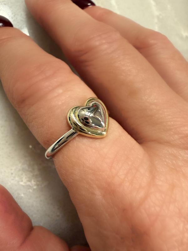 This ring is beautiful. It has just enough projection so that it doesn’t get caught on things. The size and two tone metals are perfection.
