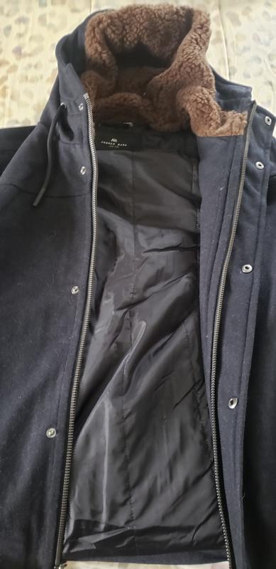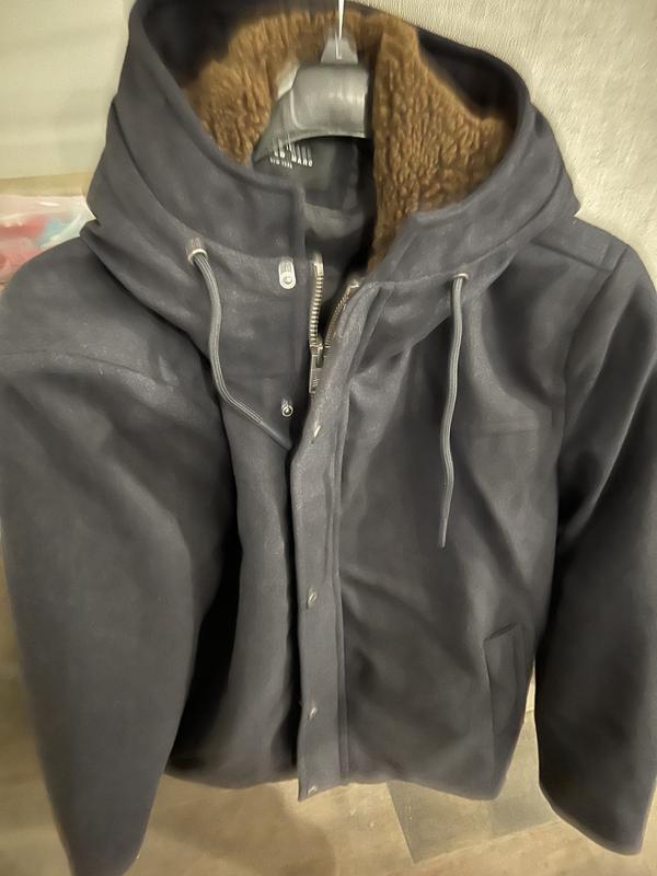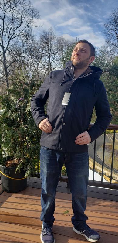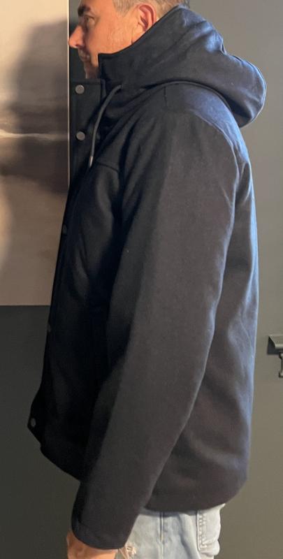 The coat overall is a nice navy color, mid-weight and the style is very nice. The hood/neck area are very off though and hit very high in the back making it hard to turn your head. The fit was true to size.