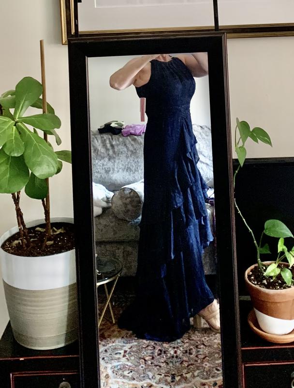 Very pretty midnight blue color but the ruffles did not fall right on me.