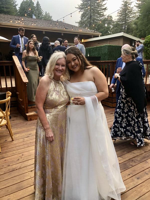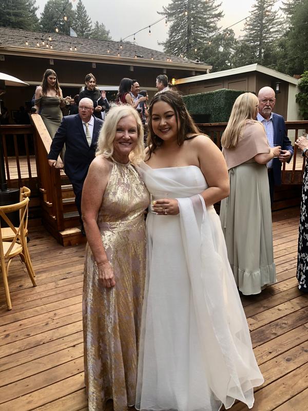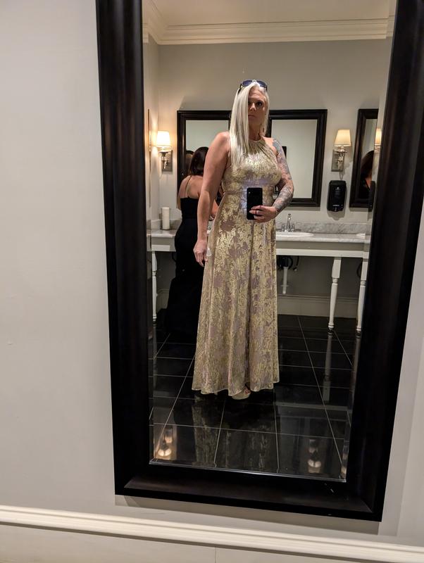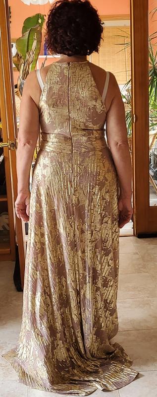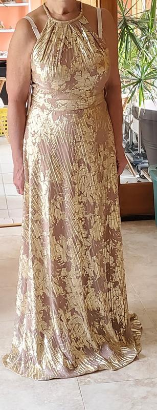 This dress is beautiful. Fits well, very elegant and has pockets. It is quite long and will need to be altered. The gold does flake off.