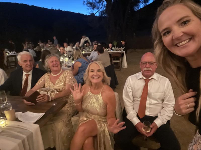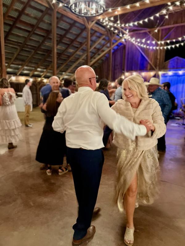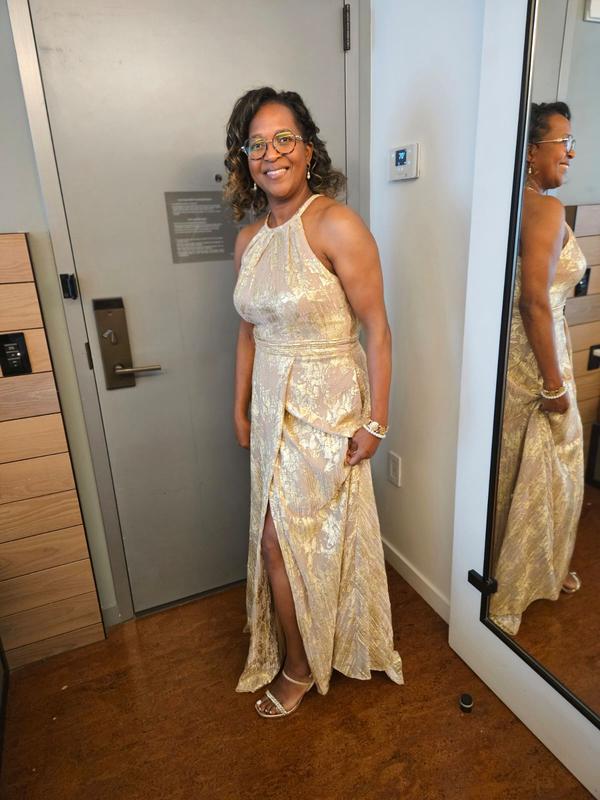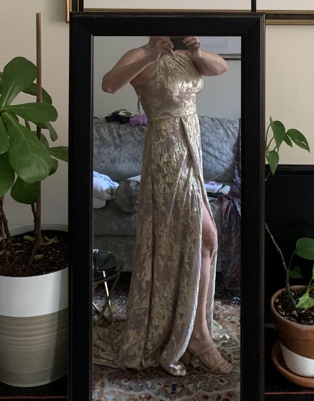 Beautiful gown. Shimmer is lovely. I am 5’4” and with a decent heel, too long for me. Didn’t have time to hem so had to return. Flows beautifully when you walk and has a small train. The slit is problematic. Better have a seamstress take care of that or will flash the world.