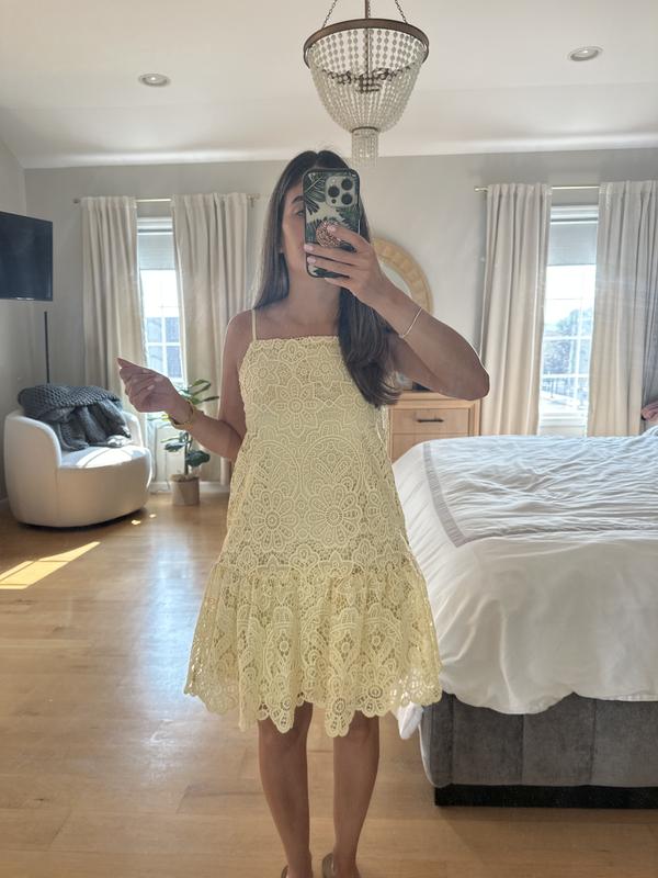 Very buttery yellow and cute. Like the crochet and the length I’m petite 36DD and ordered large it runs big a bit boxy but the dress is flowy and will flow around your curves nicely