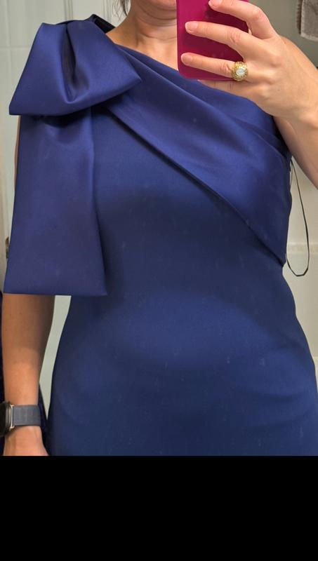 Dress is lovely - felt a bit like a present the way the bow sits. Color is stunning and its very comfortable to wear