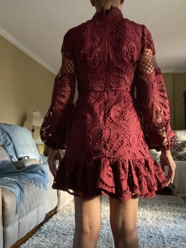 This dress is very pretty and the quality seems good. However, the cherry color is much darker in person than the photo. I was hoping for a dark red, but it's almost a dark brown. It's TTS and the sleeves are long enough if you have longer arms. I'm average height - about 5'5" and the XS is really short. I thought it would be longer on me than on the model, but it's so short that I literally can't bend over without exposing my entire bottom! Sadly it's going back.