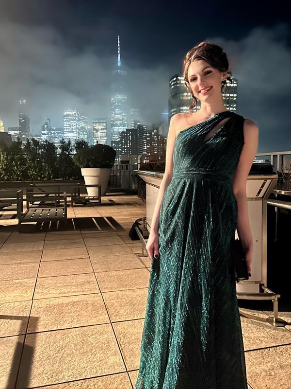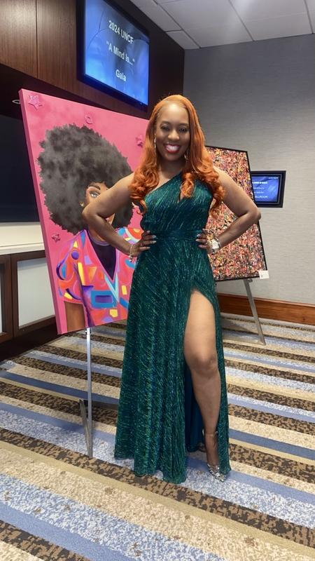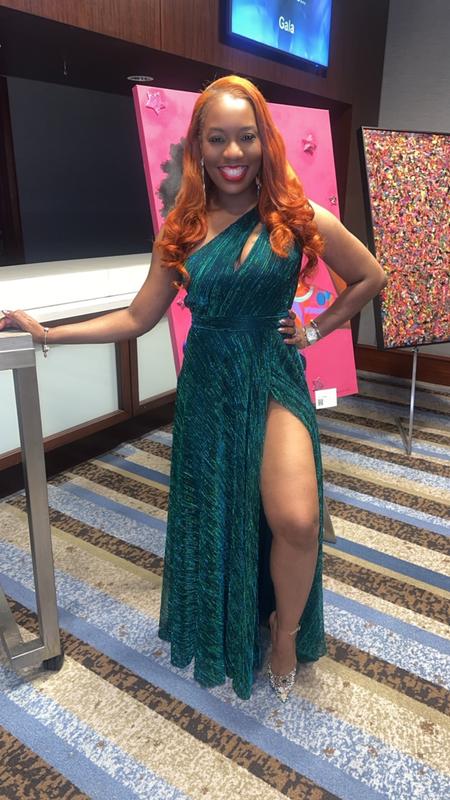 This was the most beautiful green off the shoulder i have ever put on. It was the perfect dress for a black tie wedding.