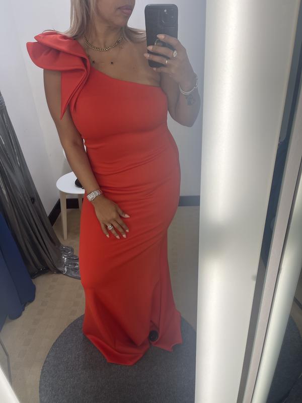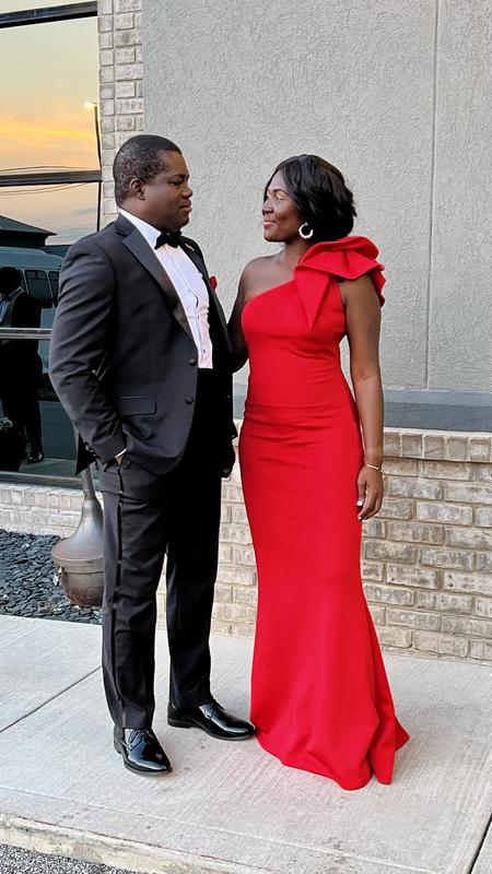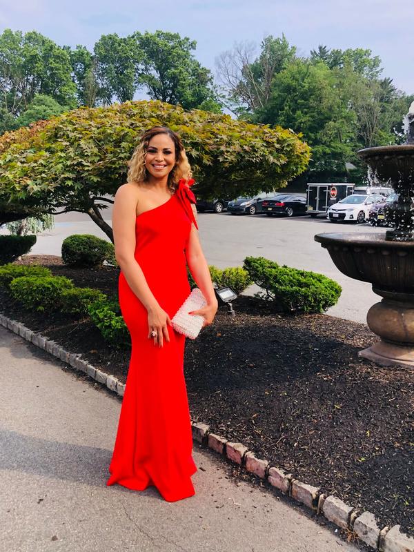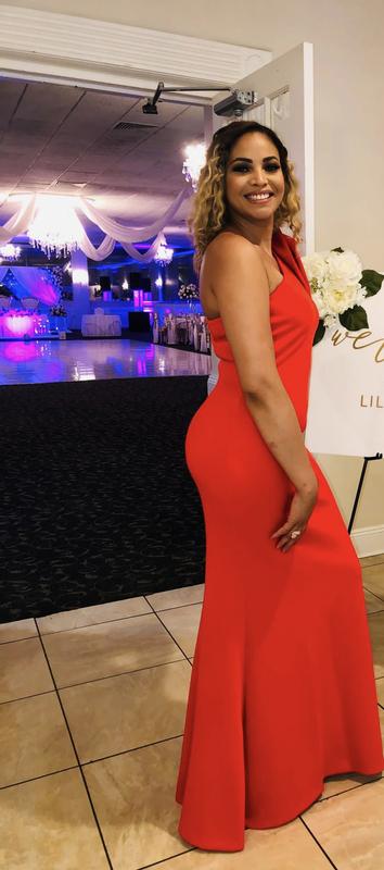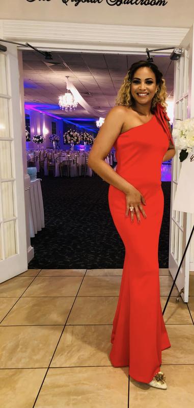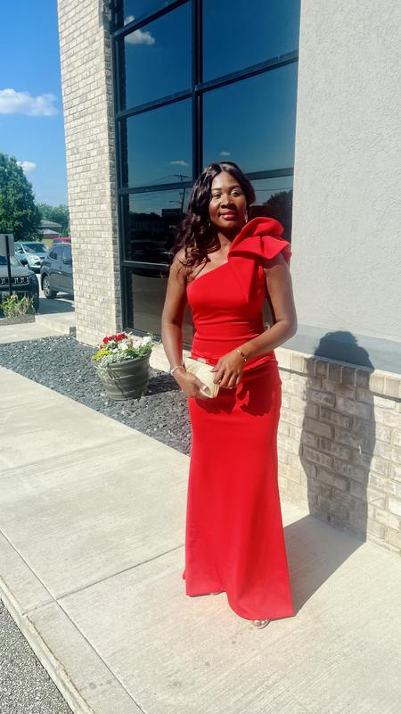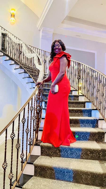 This gown has a wonderful mermaid cut that enhances curves and the vibrant red makes you look stunning. Another plus is the affordable price.