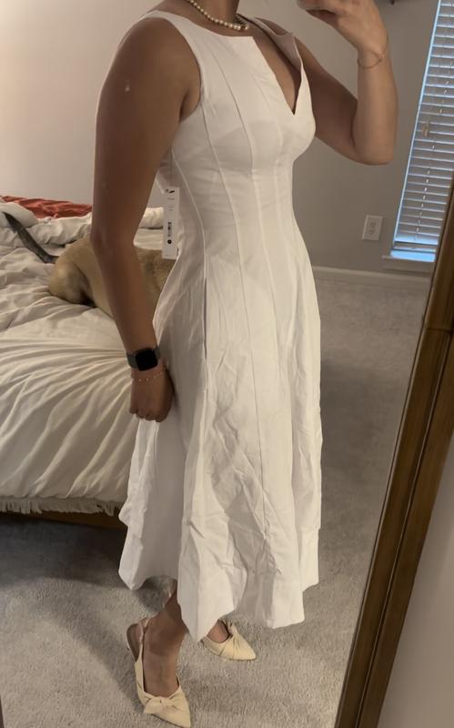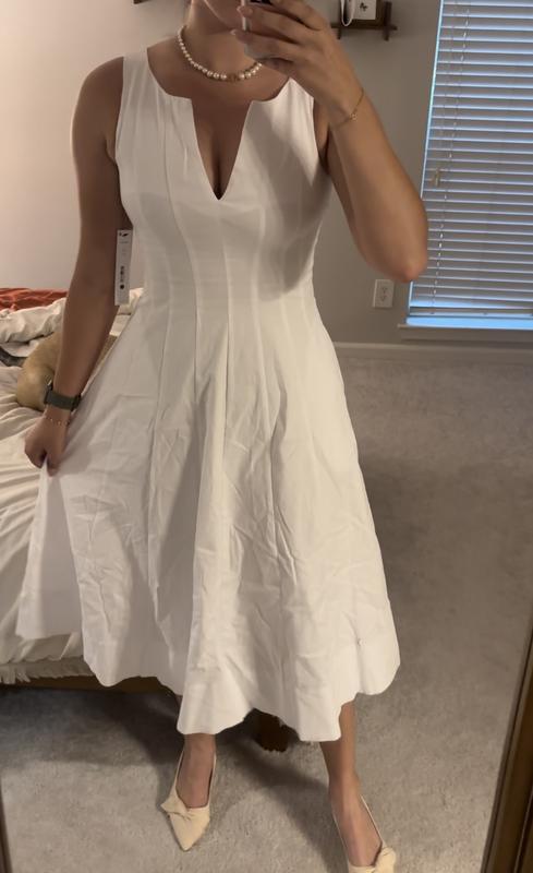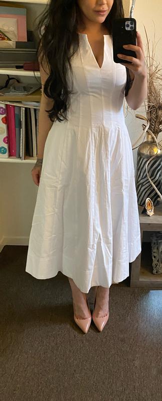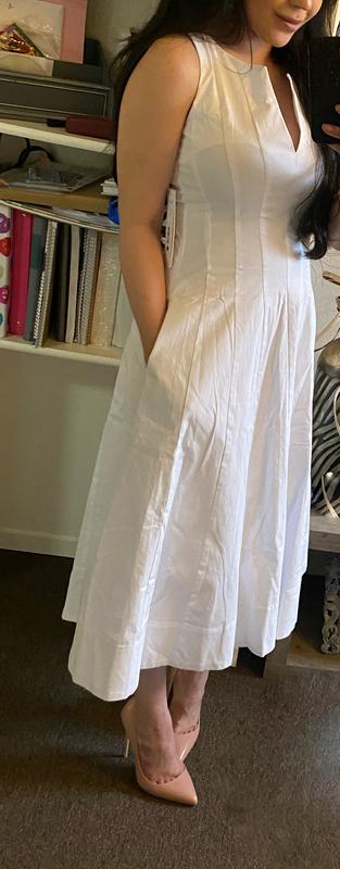 This casual cotton dress makes a nice addition to any wardrobe because it's well made. The top is fitted, and the skirt is A-line. Unfortunately, I could not keep the dress due to my size 36 D cup size. I'm a petite woman, so there is plenty of room in the hip area of this dress. A size medium would be too large for me.