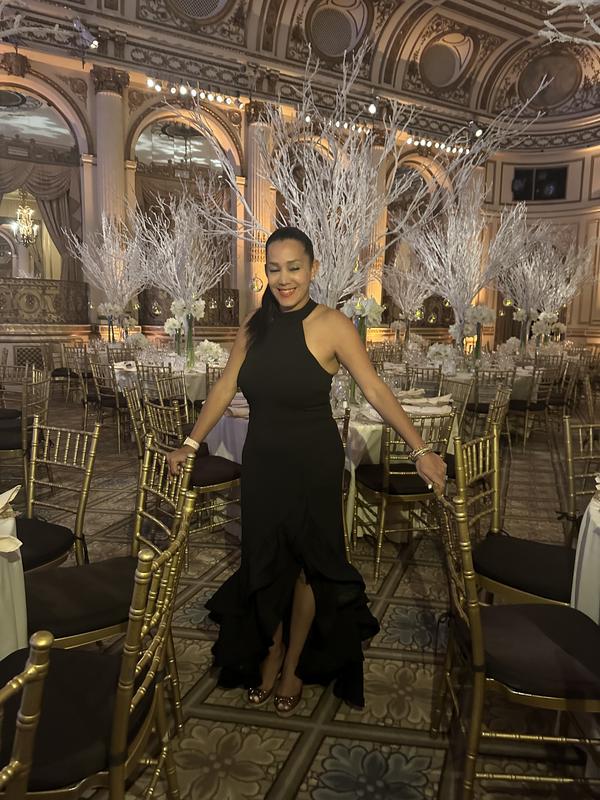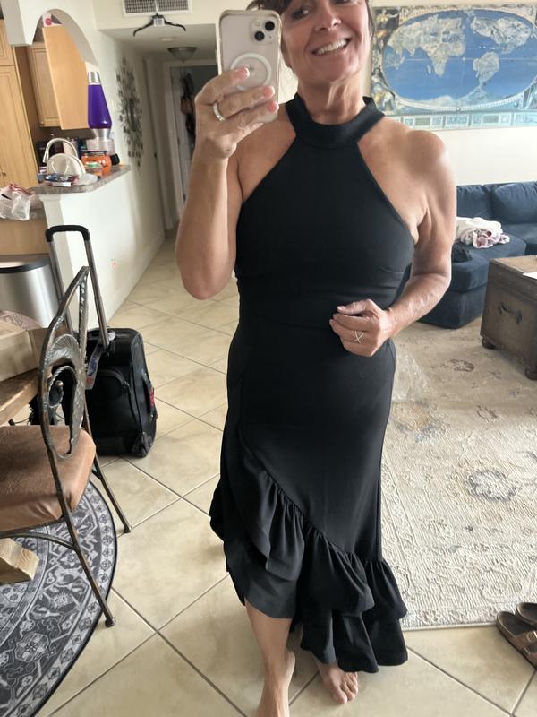 Ordered this in black and it is stunning. The ruffle hem is gorgeous and the halter top complements it nicely. I did not give it five stars because it was too long even with a high heel. Perfect if you are looking for a dress for a black tie wedding.