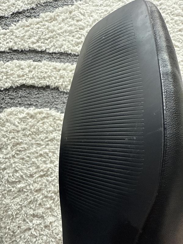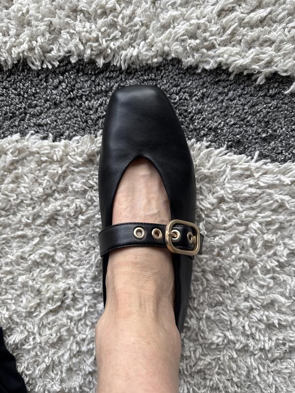 Shoe has a unique and chic top view , which has a square toe and oval entry with a pointed apex. Leather is soft and gold hardware is trendy, fun, and good quality. Two upgrades would include arch support ( currently none) and a better quality sole, which would have more grip.