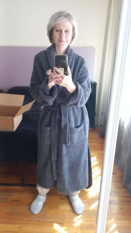 I love this very soft and warm, generously-sized robe—lots of wrap-around so—no gaping open. Both comfortable and chic.
