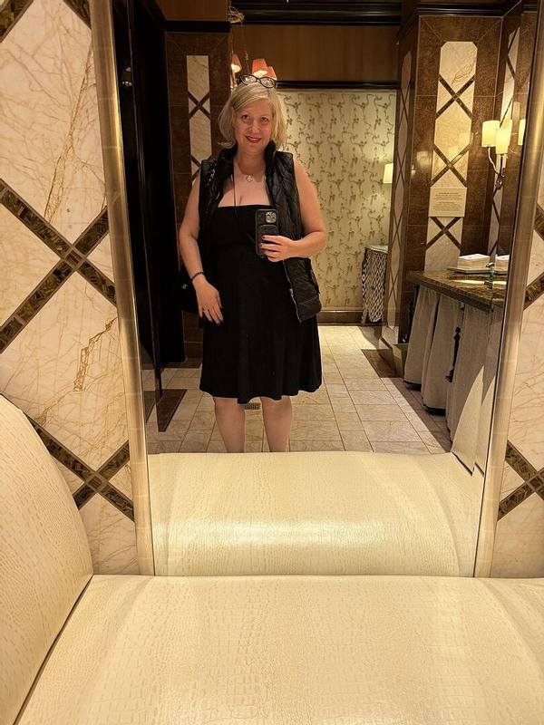 I absolutely love this dress. It feels soft with no funny chemical smell smells. The length is great for my 54 year-old legs and the color is almost black and goes really well with almost everything I own. My favorite part is that I just get to throw it on with and undergarment no bra necessary. With menopause it’s nice to be able to wear a vest or jacket over it and take it off when I get overheated by winter weather and heat. Perfect for summer or winter that’s why I ordered three of them.