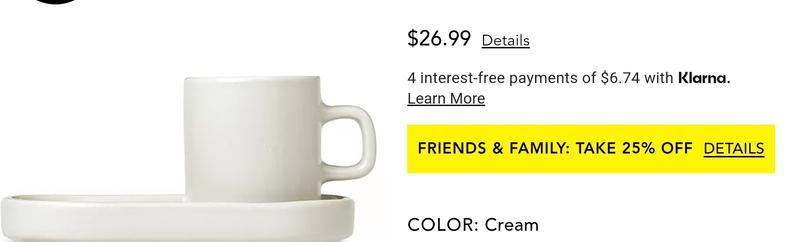 I waited nearly 3 weeks for this cup set to arrive and when it did, the color seemed off. To the naked eye and in the kitchen next to my cream colored mugs, it looked like a hint of Gray. I couldn't put my finger on it but it has a light tint of Gray and these are perfect for you, if you are looking for something with a Touch of Gray however, I ordered cream to go with my other cups. I'm not sure it's worth me returning and exchanging considering that the color batch may be off or it may take another 3 weeks for the cream color to arrive. I turned the box over and sure enough, it stated that the color was "Moonbeam", Moonbeam has a natural gray tint to it, it is a beautiful color if light gray is what you are looking for. Funny thing is, that "Moonbeam" is not even a color selection on the website. The description and box said, family company from Germany but then state, "imported, made in china". Current Price is $26.99