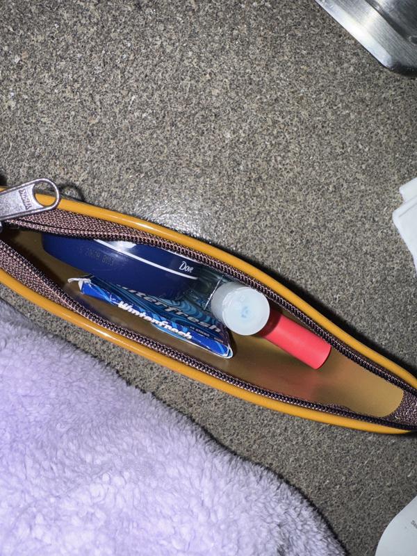 Large enough for a few lip products of varying size, compact mirror, compact powder, powder puff and travel size perfume. Also small enough to fit in any bag/purse. Liquid proof so easy to clean. The pouch would make a great gift or socking stuffer.
