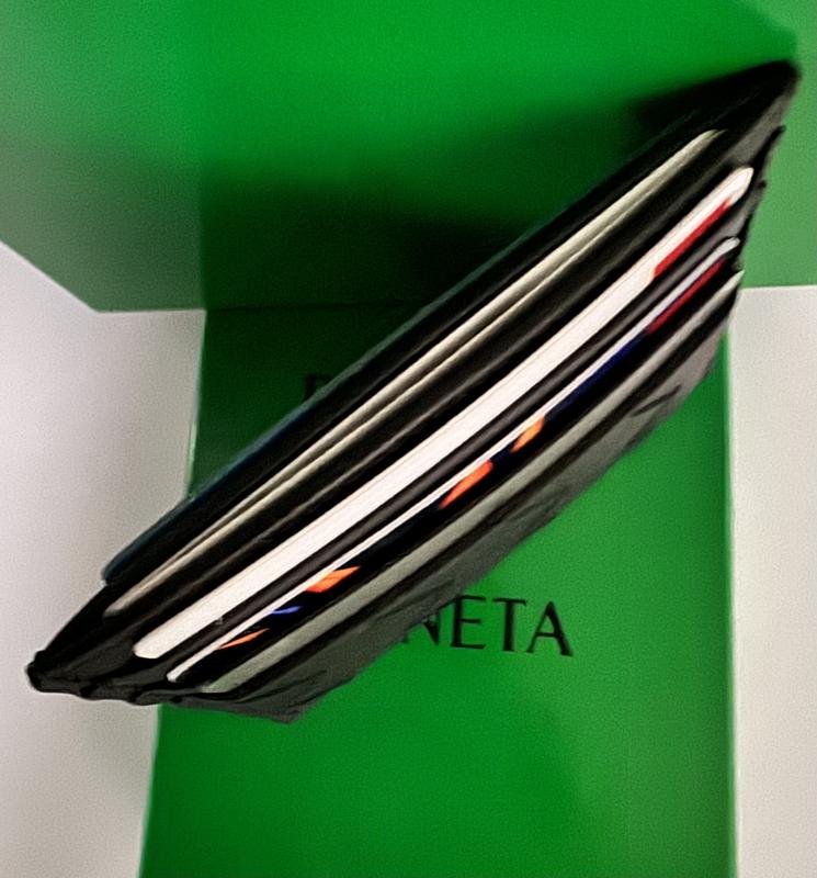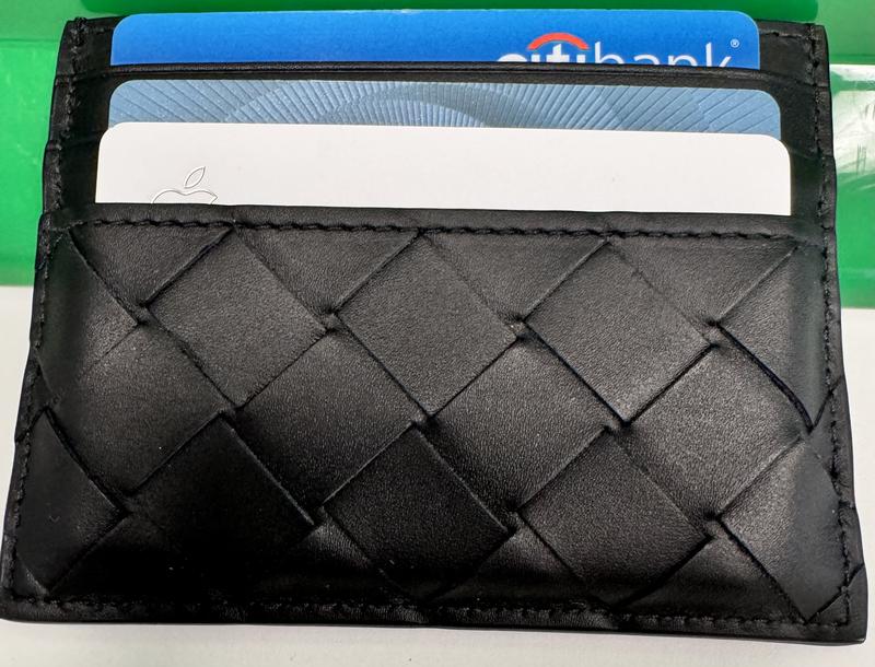 I am very happy with my Bottega Veneta card holder. It has 3 slots on each side on top of the center holder so it fits all my credit and ID cards that I need to bring with me all the time. The material is very sleek and soft. I simply love it!