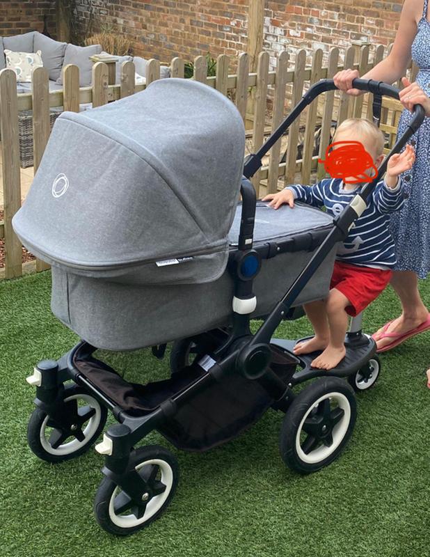 My two year old sits comfortably on the Bugaboo comfort wheeled board. When she gets a taller, she’ll be able to stand comfortably. Perfect for days out. No problem getting on and off pavements and no issues with uneven surfaces. I wish the seat attachment could extend so their head is either under or over the buggy handle.
