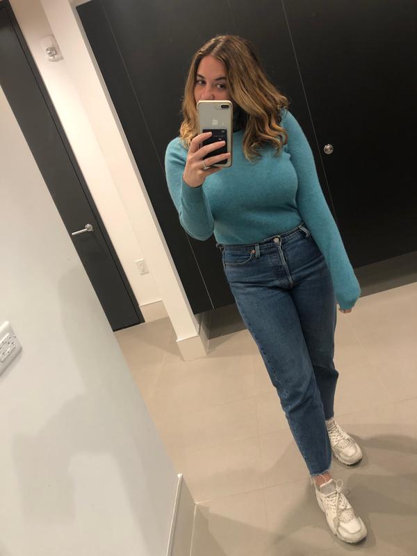 I’m 5’5, currently 126lbs, 32 DDD @ VS and small fit perfect. Rich chocolate color and quality cashmere. I forgot that I already had a chocolate brown cashmere turtleneck from RL but like this one so much I’m thinking of keeping anyway.