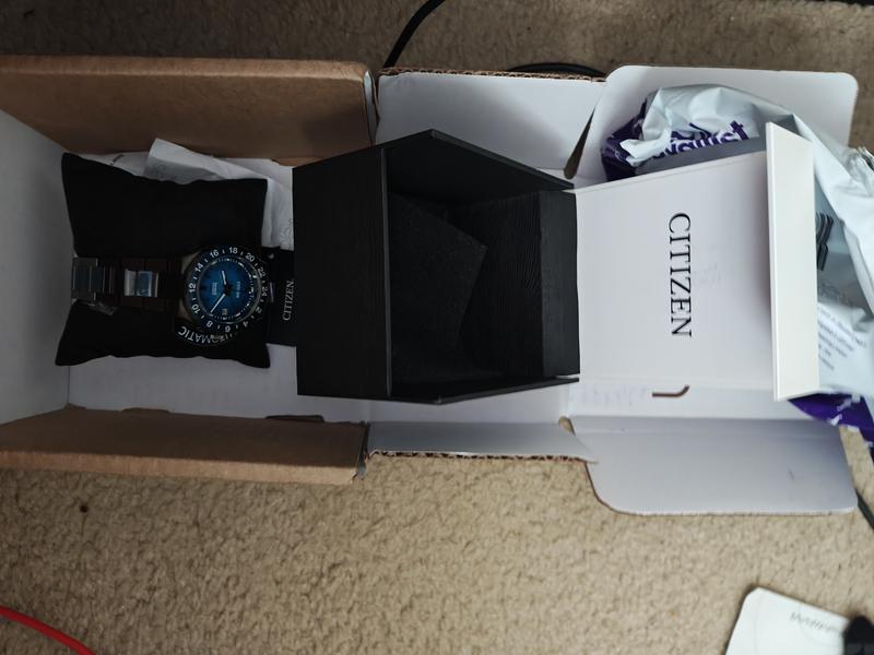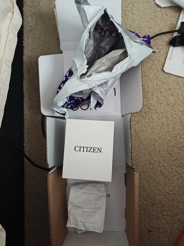 The watch arrived in a generic small black and white color Citizen box, missing the manual and whatever should be included with a new Citizen watch. I checked Citizen's website and this watch comes with a big fancy black color box. Not sure if this was a returned watch or display model, but sure not a factory new Citizen watch. For the money, I expected a factory new Citizen watch. Returning for a refund.