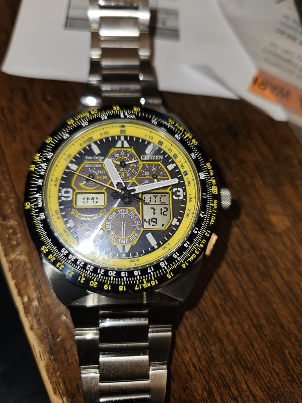 Beautiful watch that is very substantive! I love the presentation, weight of the watch and the little details that citizen did! For example, the box is a beautiful helmet that is an exact replica of the Blue Angels helmet with the color, shield that closes and opens to reveal the watch! The downside to this watch is that it is complicated. Very difficult to set the time. I watched several videos on YouTube and downloaded 150 page instructions. Brought it back to the retailer (Macy’s) that I bought it from and they couldn’t program it. Alas, I found an individual who happened to be very familiar with this watch and helped me to program it.
