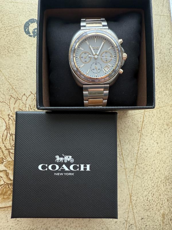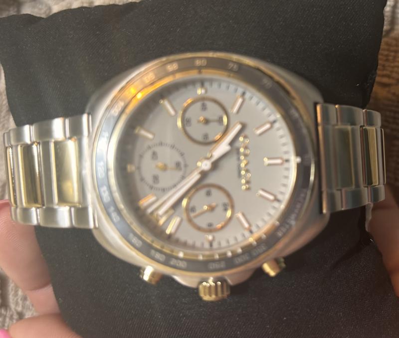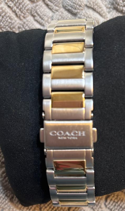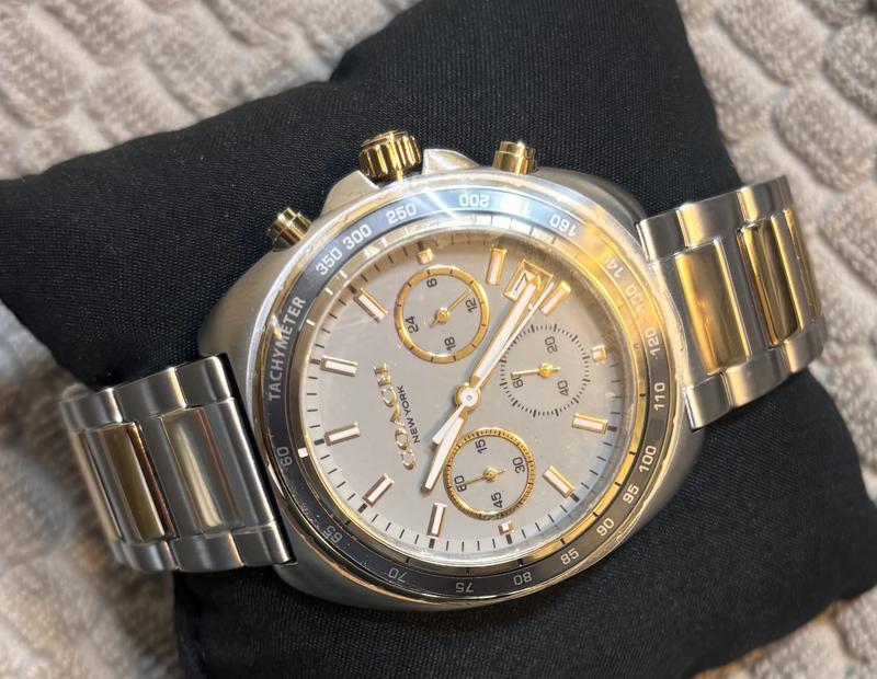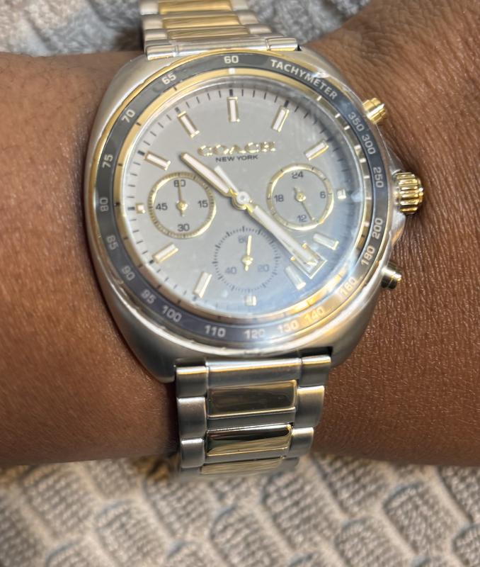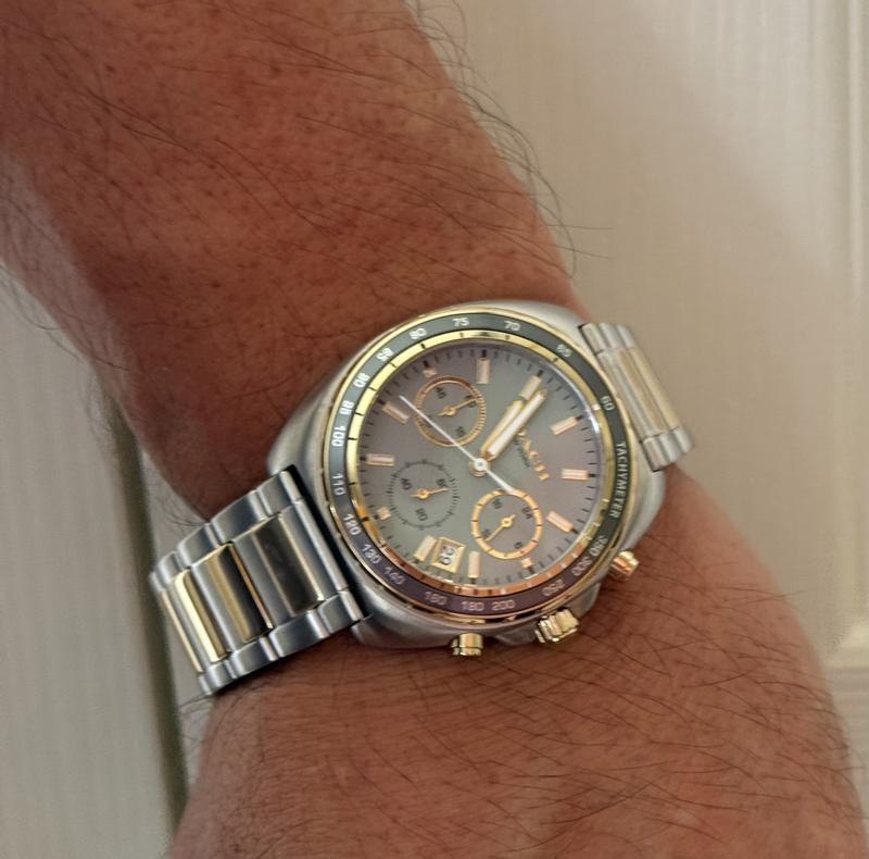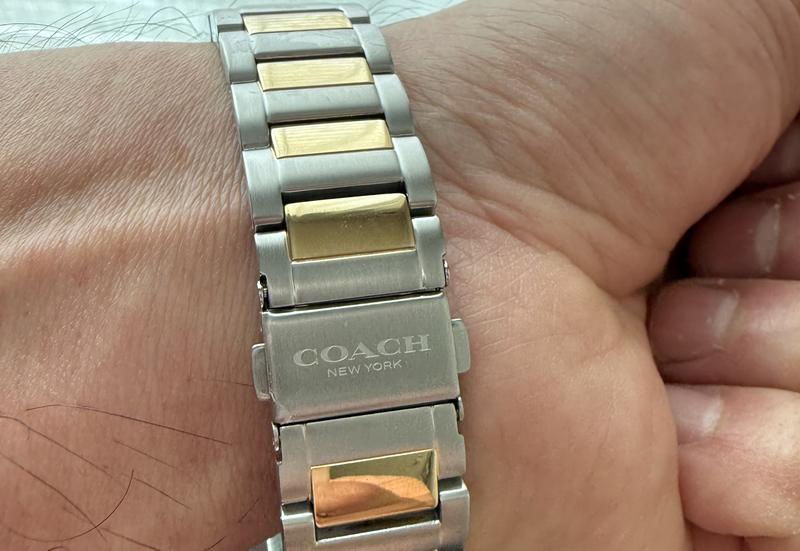 This Coach watch is just a beautiful piece! A favorite of my husband for date night. It has a classic two tone stainless steel strap, and a clasp closure. The watch face is a classic!!! It’s water resistant and the 39mm case makes it great for everyday wear. My husband says it’s very comfortable on the wrist. Overall great style!