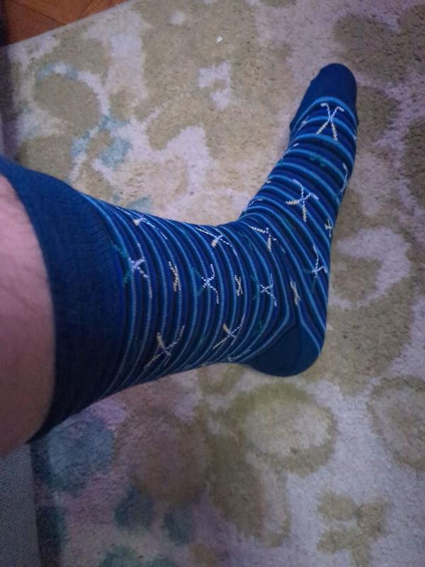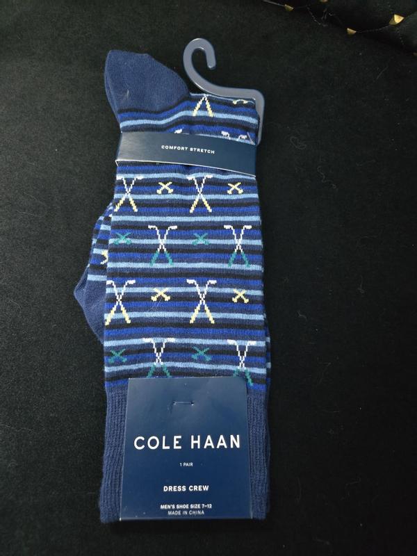 Nice soft pair of dress socks by Cole Haan! Very comfortable, lives up to the Comfort Stretch label. Socks are thicker but not too thick where they bunch up when you put dress shoes on. Design and colors are a plus as I've received several compliments on them!