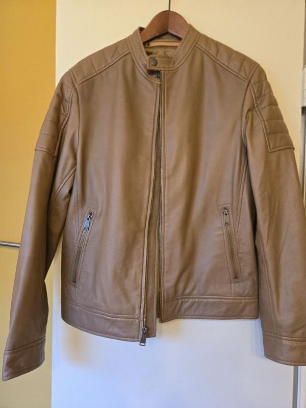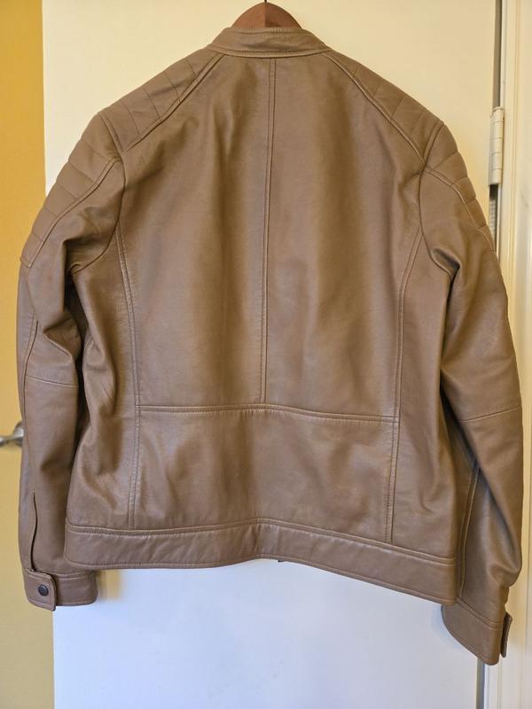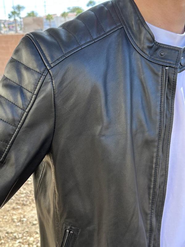 I like this jacket a lot. Very simple lines, the shoulder seams are very smooth, and without all the excessive design work you see on some leather jackets. Leather is soft and supple. The leather feels substantial but not overly thick or stiff. It has a very SLIGHT distressed look which I really love. I love the cafe racer style jackets. Highly Recommended.