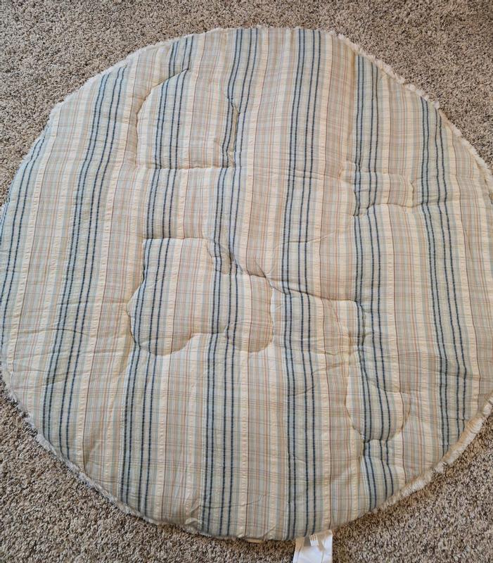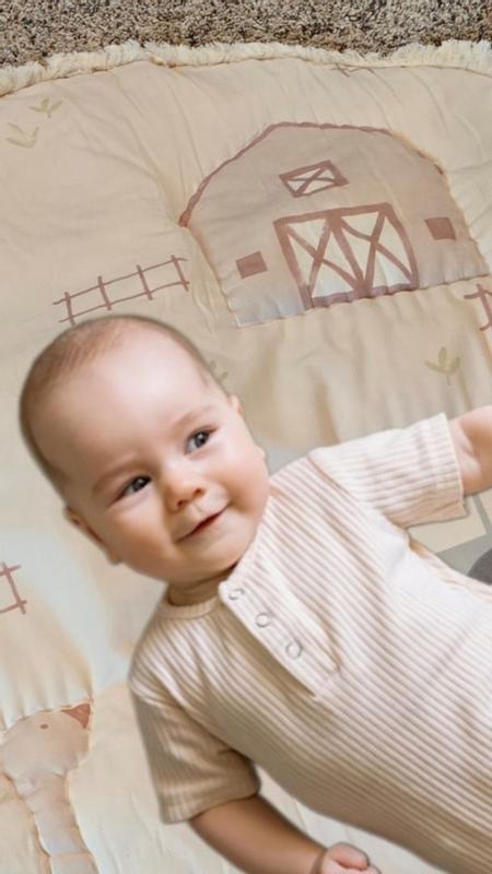 I received crane baby Charlie farmhouse quilted baby play mat complimentary from influenster in exchange for my honest review. This play mat is large and heavy duty/thick. You can use either side. It is more for inside use because it's white on one side. It has a slight cushion to it and lays flat every time it's used.