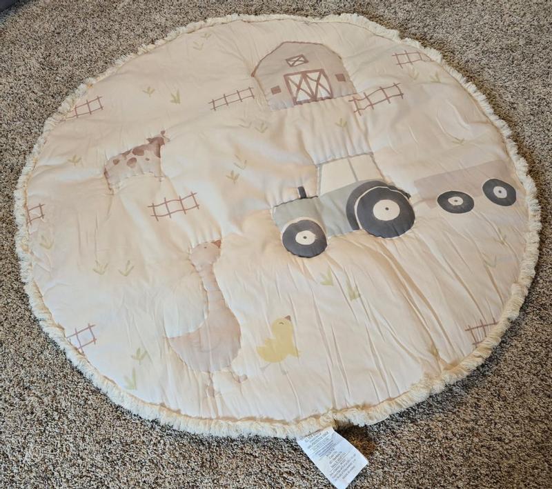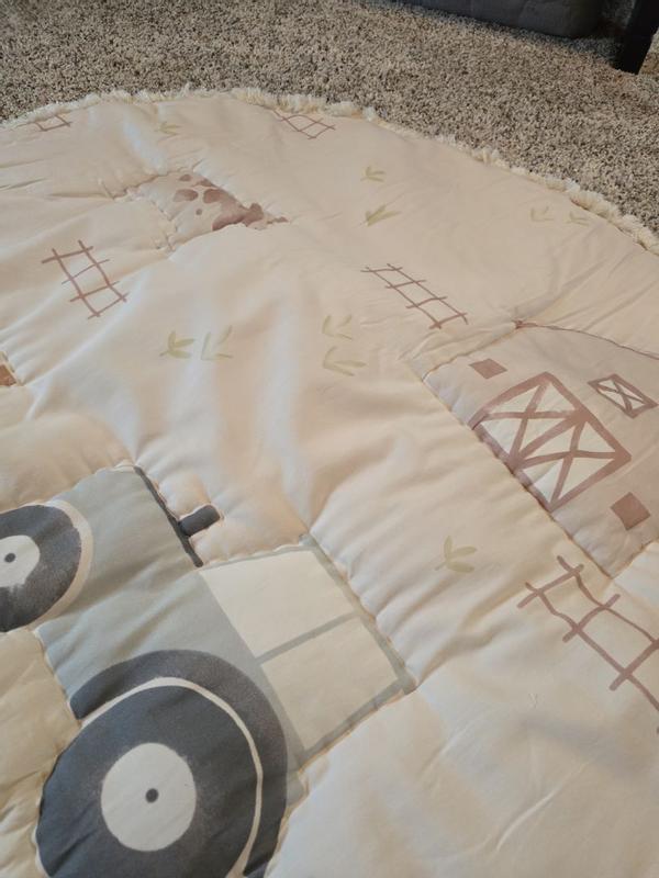 I love this play mat. It is decently thick and made of a muslin like material on the outside. The farm pattern is adorable and the plaid pattern on the opposite side is so nice. My son loves it. He kept returning to it to sit and play. I would include more picture but it is in the wash due to a peanuts butter sandwich incident. I would definitely recommend this for nursery devote or as a tummy time/ play mat.