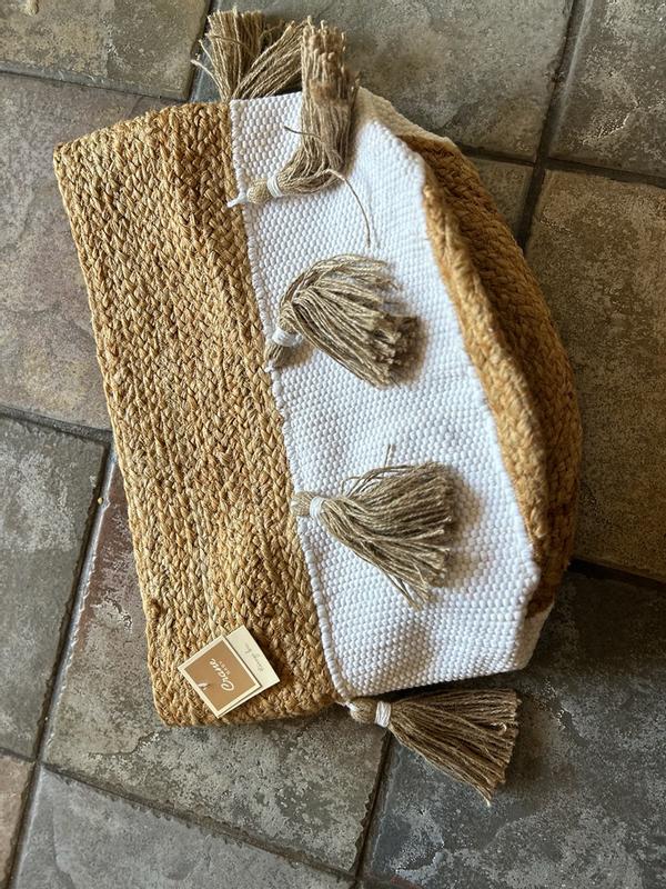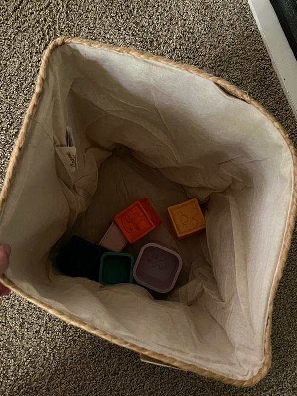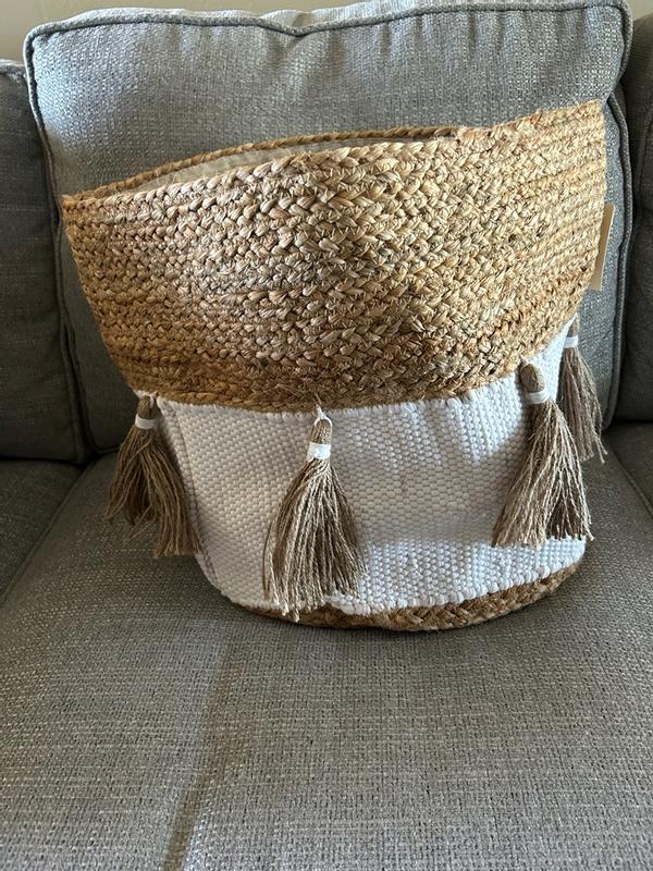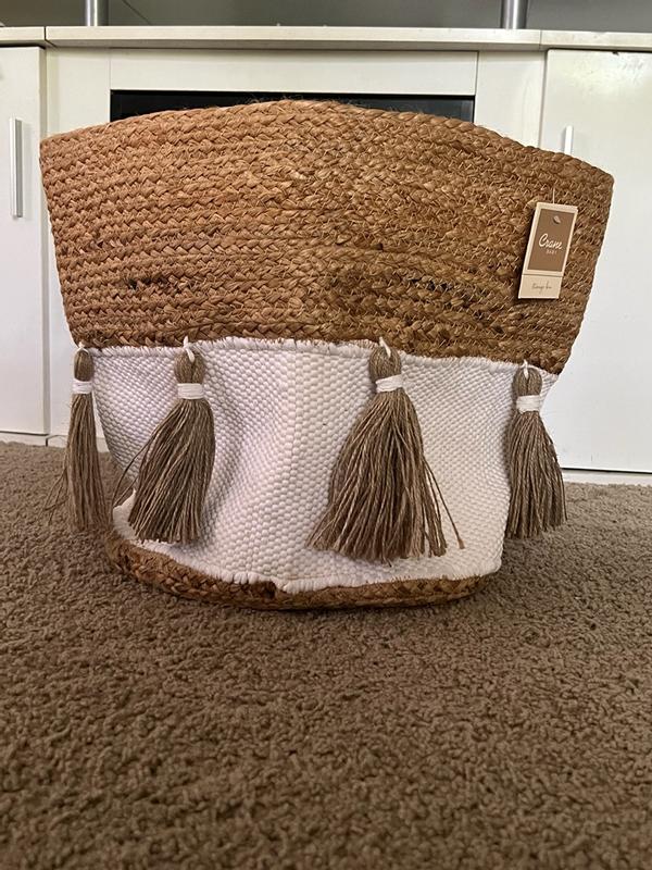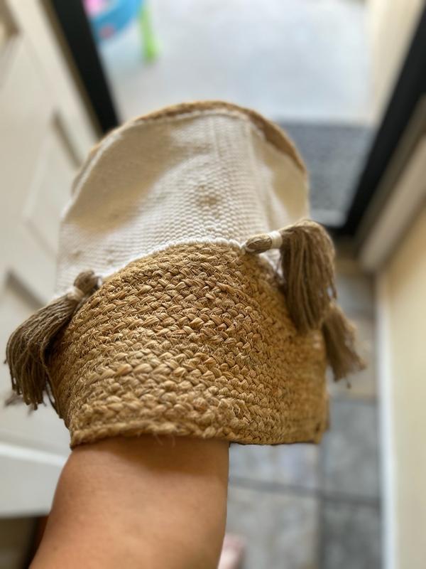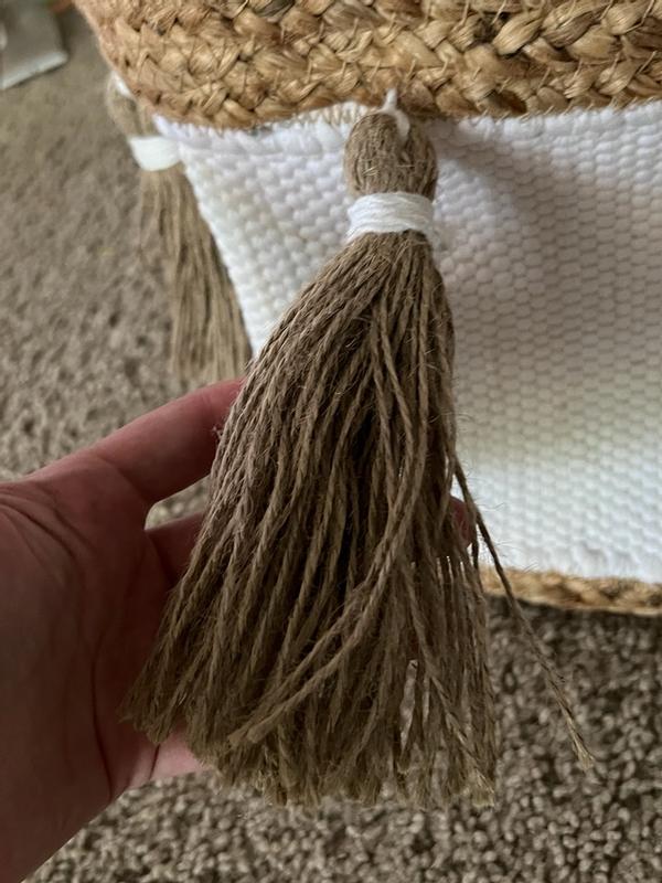 Right out of the package it smelled of chemicals. We aired it out for at least a week and the smell is faint. It’s beautifully crafted and the detailed tassels are very attractive to have this catch all basket for my kiddo placed in the living room. It is very deep front tip of my fingers to my elbow. My 1 year old has already pulled on the tassels ALOT and they are intact and have not unraveled apart he has also picked at the brown braiding and it has not unraveled either. The versatility for this basket is endless as my toddler grows. It will probably end up in my car to put extra clothes, wipes, snack, and anything he may need throughout his growing years.