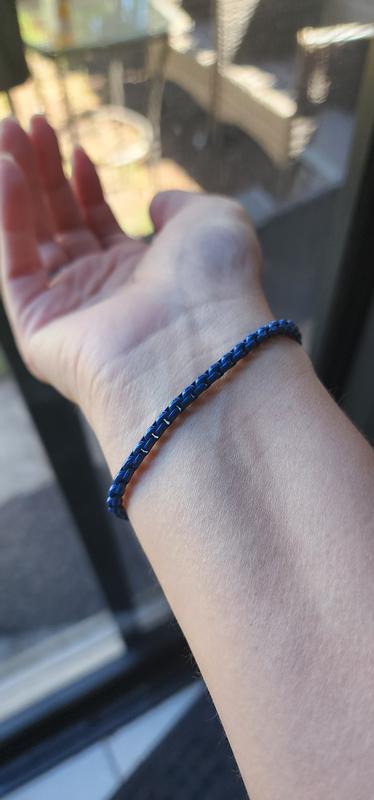 I actually bought this as my SOMETHING BLUE for my wedding coming up. This a beautiful bracelet. The hue of blue is not so deep navy as to not notice the blue. In the sunlight, the color really shows. Beautiful and delicate, but not so delicate as it would break easily. I bought it because my son has one that is thicker and he loves it as well! Not even my wedding yet and I'm already wearing it!