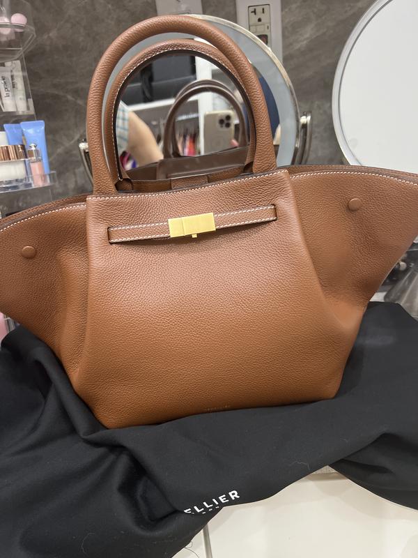 A beautiful tote bag that is not oversized for me. I purchased the black leather though the brown suede looks gorgeous as well. Well made by this premium brand. The midi (smaller model) is perfect size for me. Looks so good on my arm, just like all the international photos on Pinterest. Just note for holding your items, you can only fit things like a wallet, make-up bag, etc. in the center section (flat bottom area). The winged extensions do snap shut for security and I lay my gloves there. Overall, absolutely love the bag, glad I found it at Bloomingdales and I recommend it.