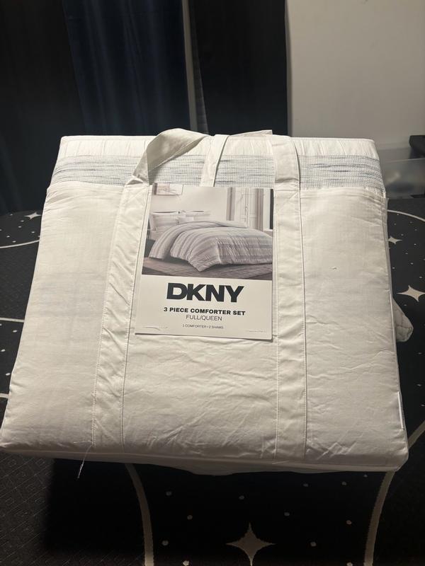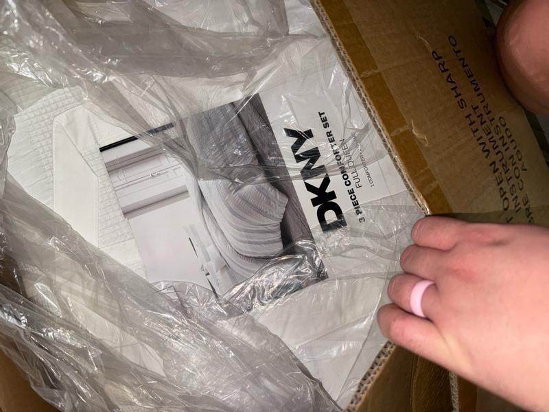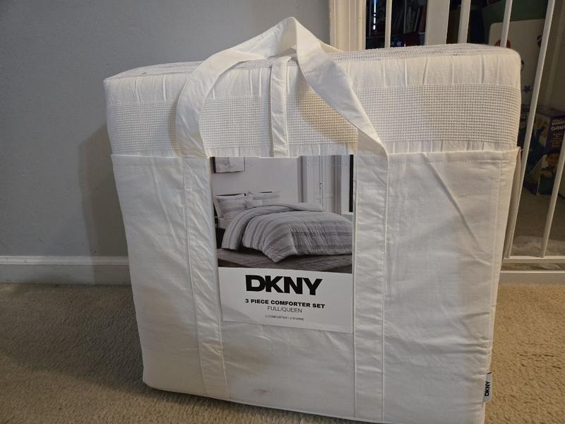 DKNY comforter is super comfy has a simple design and it’s large enough for 3 people had a very soft material I definitely recommend definitely will buy this and other products