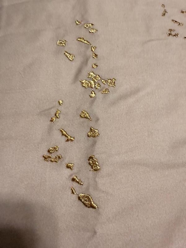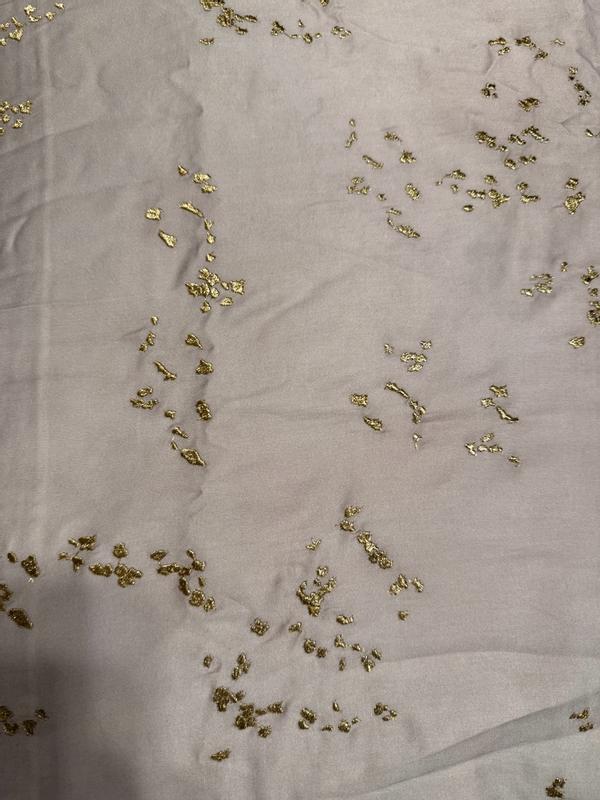 Absolutely gorgeous! It’s so soft, and a dream to sleep under. It’s thick and luxurious fabric, with also being breathable. The design is gorgeous a beautiful blush watercolor that gets deeper in places and beautiful gold embroidery that pops on all the different shades of colors! The underside is a brilliant champagne gold that shimmers with the light and is a perfect complement to the front!