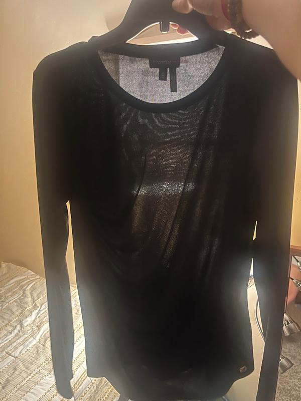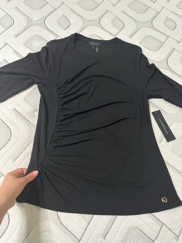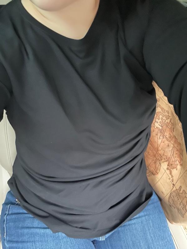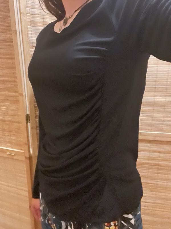 This woman’s long sleeve ruched-side top fit me perfectly. I love wearing black and it’s a dark black, it isn’t see-through. It is flattering in the stomach area and it looks nice.