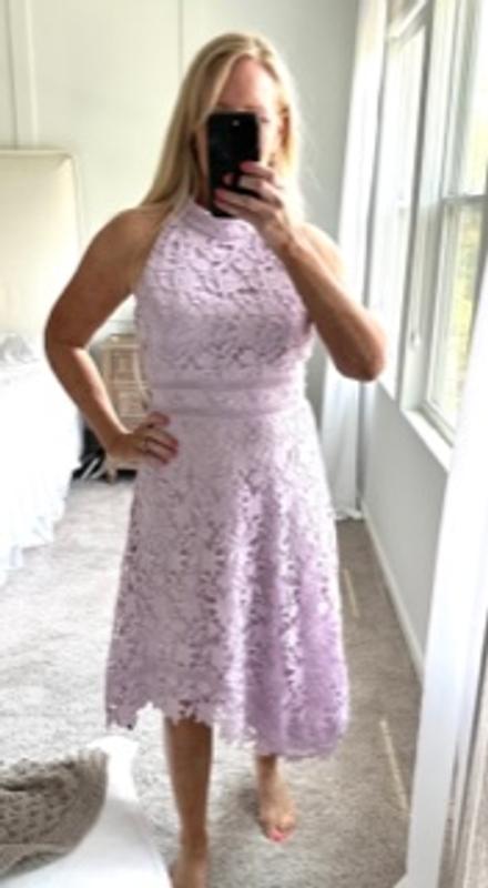 Dress is beautiful but fits weird! The halter collar is uncomfortable and the lining makes me sweat. The lace is gorgeous but the design is not flattering at all. Returned!