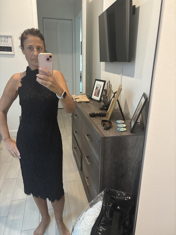 This dress is beautiful! The lace fabric is lovely with a bit of stretch which makes it fit just right. I really like the feminine edge details on the dress it looks so pretty. I am so very pleasantly surprised about the great quality of this dress, considering the reasonable price point. This dress is worth every penny and more. I am 5”9’ and 130 and purchased a size small. Looks like it was made for me.