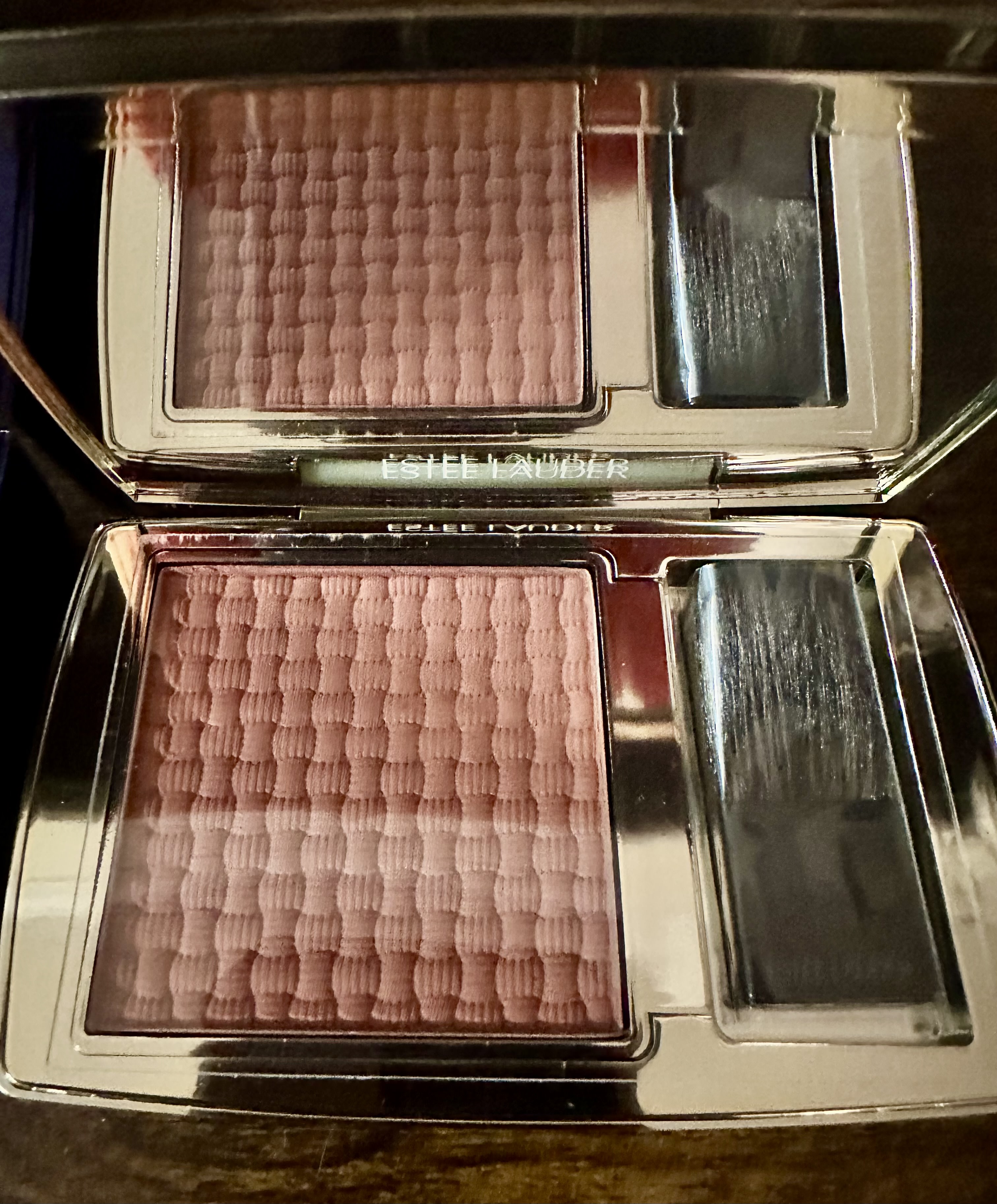 I LOVE this blush duo. The color is beautiful and the combination together is perfect. It blends with my skin perfectly. You a light application and you have a perfect daytime color, a heavier touch and you increase the drama.. Perfect. The feel is light and silky on It lasts all day and looks very natural.. I would definitely recommend it and will purchase more. .GOOD JOB, ESTEE LAUDER!