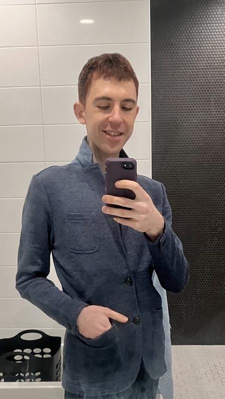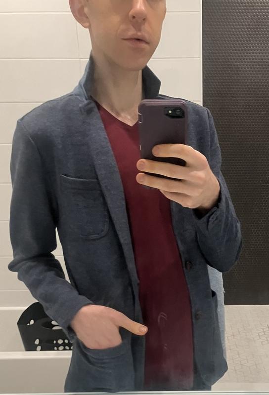 Very cool Sweater Blazer. I have worn this a few times now and get compliments each time. It is great for outings that don't require the texture of a fitted jacket. Looks casual, but nice. I wish the sleeves were slightly shorter, but no unconstructed jacket fits perfectly. Unfortunately due to the unique cuff/button it is not something you can get altered (according to my tailor) without changing the look, so I avoided doing that.