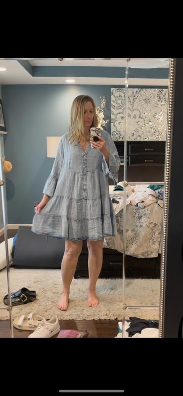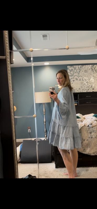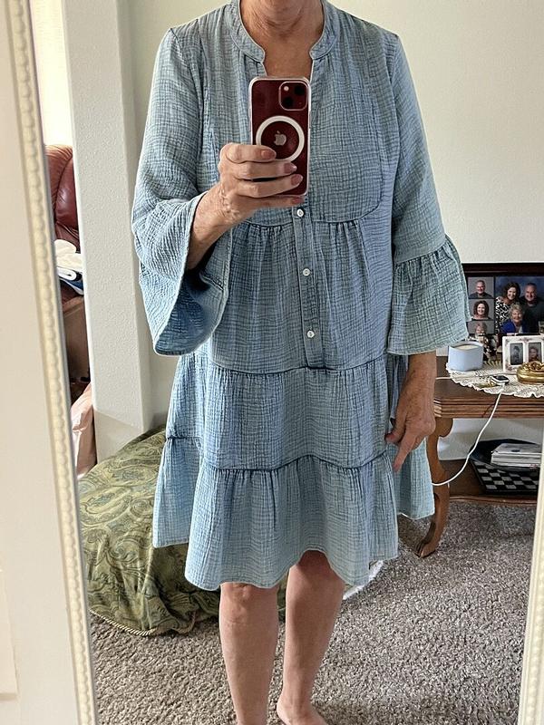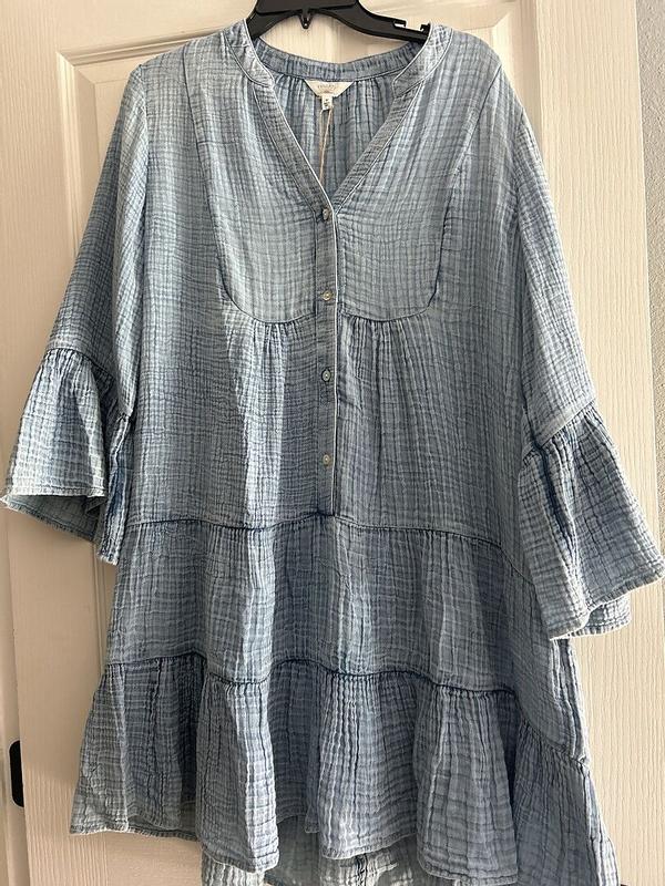This dress is so beautiful, it appears to look like a chambray fabric, but it’s actually gauze. It does run very big, I bought a large, which was huge. I returned it for a medium, which fits much better.