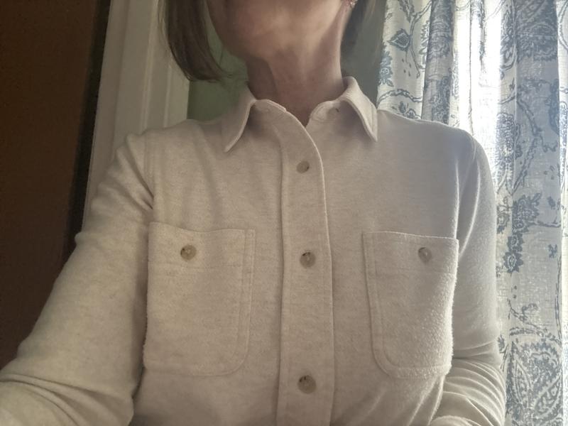 Super soft and cozy. Nice weight. not too heavy. feels so comfy and looks put together. Black twill in medium fits my petite body well. Could probably do a small for a more fitted look.
