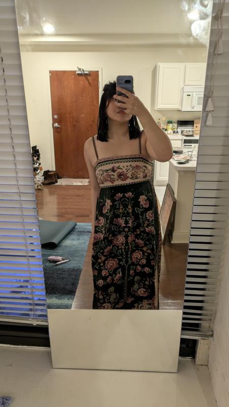 Super pretty in person, I'll be using this for an upcoming summer wedding. Smocking in the back so it's stretchy. I would stay true to size for sizing, but if you have to size down, it would still fit well around the bust.