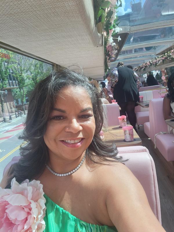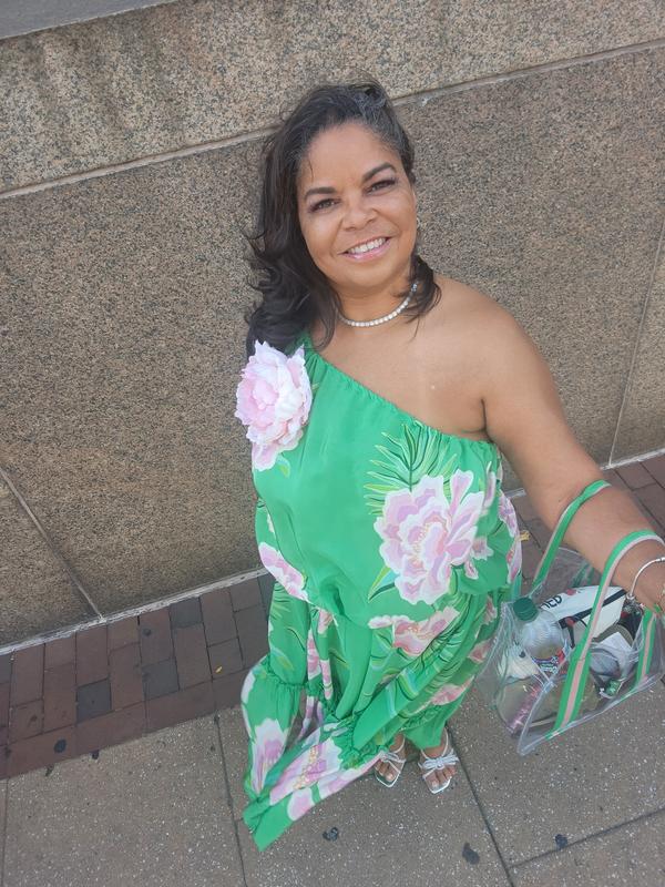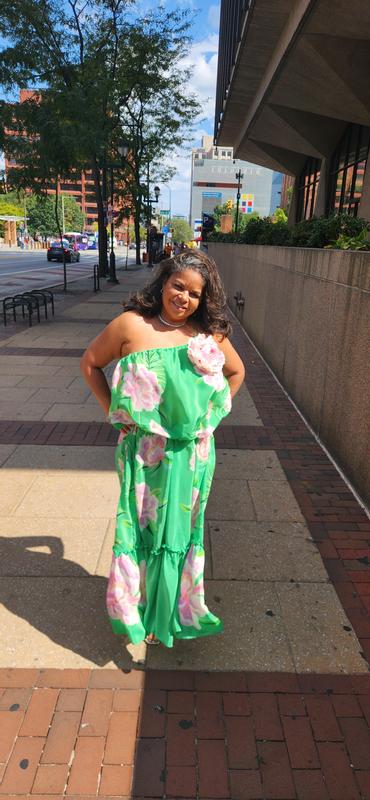 Gorgeous dress. I love the bold colors of the pink against the green. Dress fits true to size and is a loose fit. I'm 5'1 and the hem of the dress touches the floor without heels. Only disappointment was that the pink flower accessory shown on the model does not come with the dress. I thought it was a part of the dress. A bit deceptive.