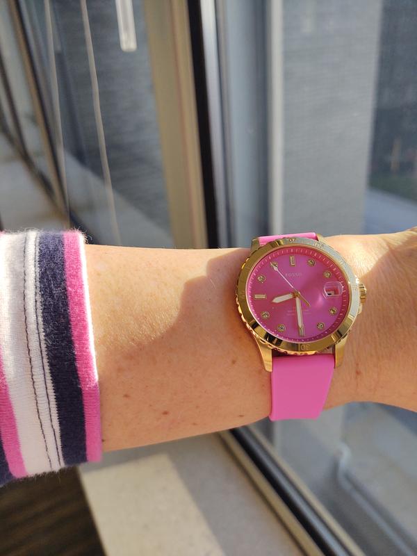 If you love pink this is the watch for you. I love the silicone band and the size, but the bright pink is the best part. Most of my watches are Fossil's, they make the best watches.
