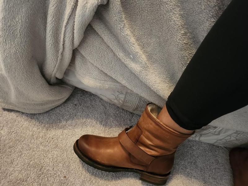 I’m a big fan of shearling lined Frye boots & have just about worn my old cognac pair that had a zipper up the back out. I have this pull on version in gray & rarely wear then. I have a bad ankle from a crush injury 18 years ago & Frye was the first quality boot company to make shearling lined leather boots I loved & could wear. The pull on is problematic for me due to random swelling & occasionally needed to wear my lightweight ankle brace in them. These are also not as comfortable as the older version. I miss the variety of shearling lined boot options & last winter I bought the over the knee tall Veronica shearling lined since my old ones were wearing out. Also not the same soft leather quality; they’re super stiff & the sole is also stiff hard plastic like rather than soft rubber true tire-like lug sole with very little flexibility or traction & a hard footbed, whereas the original version was flexible leather boot, great cushioned foot bed & true lug soles with excellent traction. Had I known they reduced the quality I would not have bought 2 pair. The old versions of this boot & the tall boot used to sell out so fast. I kept them hoping they’d wear in better but they haven’t & are problematic walking on ice & slick surfaces, so they sit in my closet taunting me. Also miss the buckle detail around the ankle on the new version of the over the knee high ones.