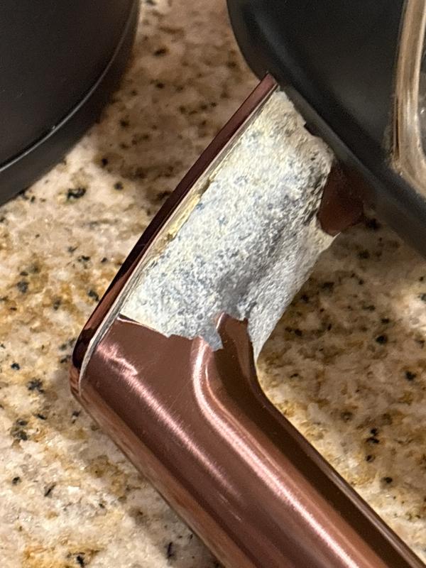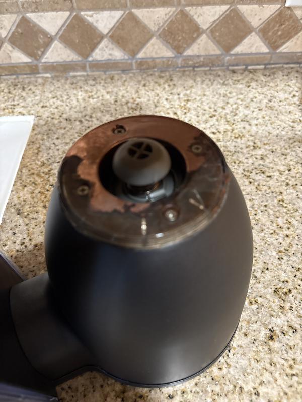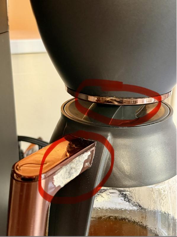 Plating chipping from coffee pot and bezel under grind basket. My mother in law has same unit and the chipped plating cut her hand. Make good coffee but after 8 months it looks 20 years old.